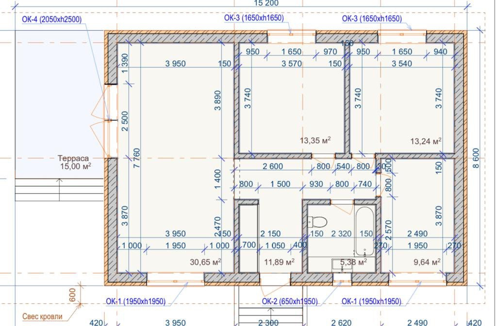 Одноэтажный дом с 3 изолированными спальнями и кухней-гостинной с выходом на террасу. Просторная прихожая с зоной под гардероб. Санузел с окном.