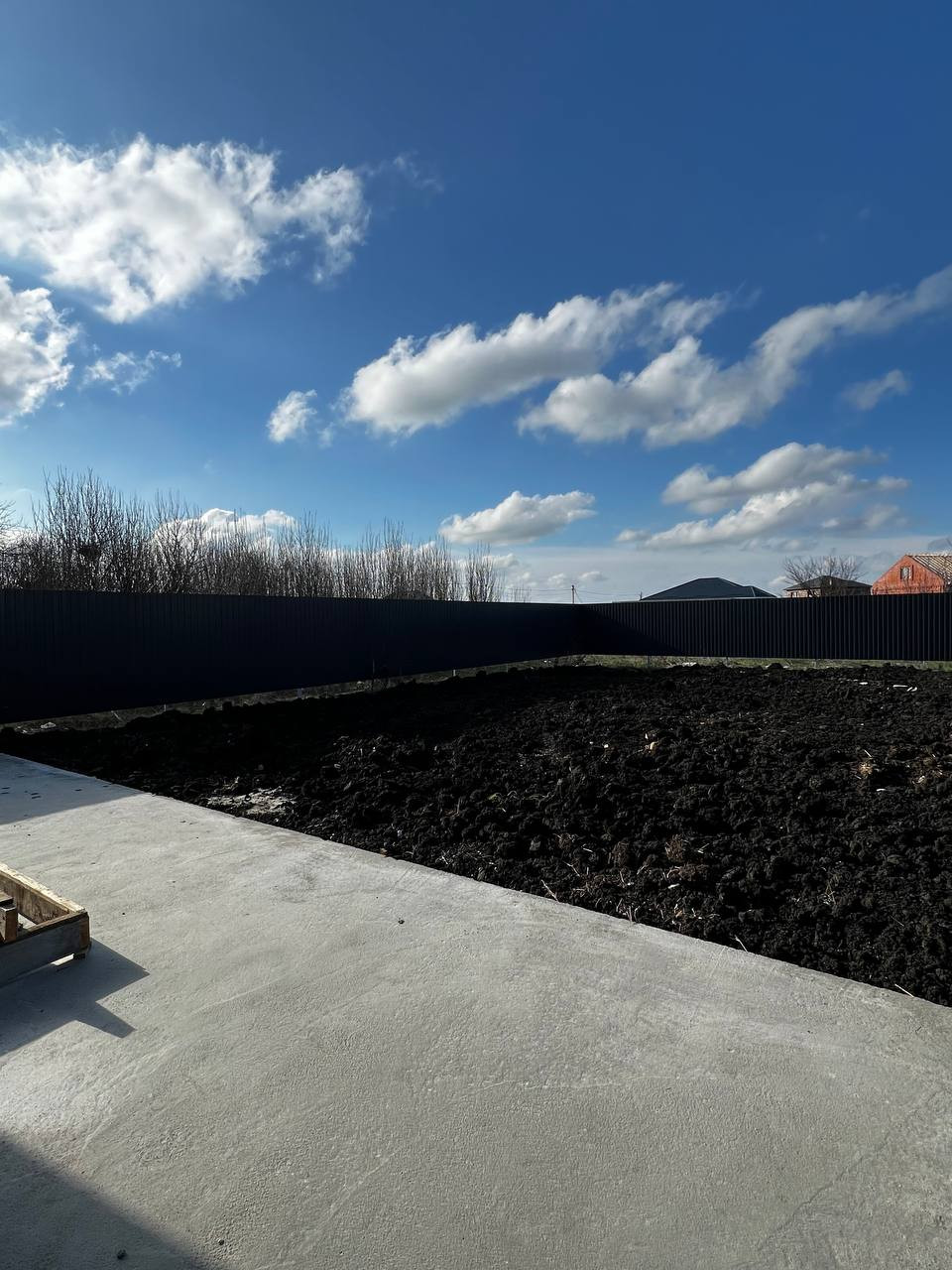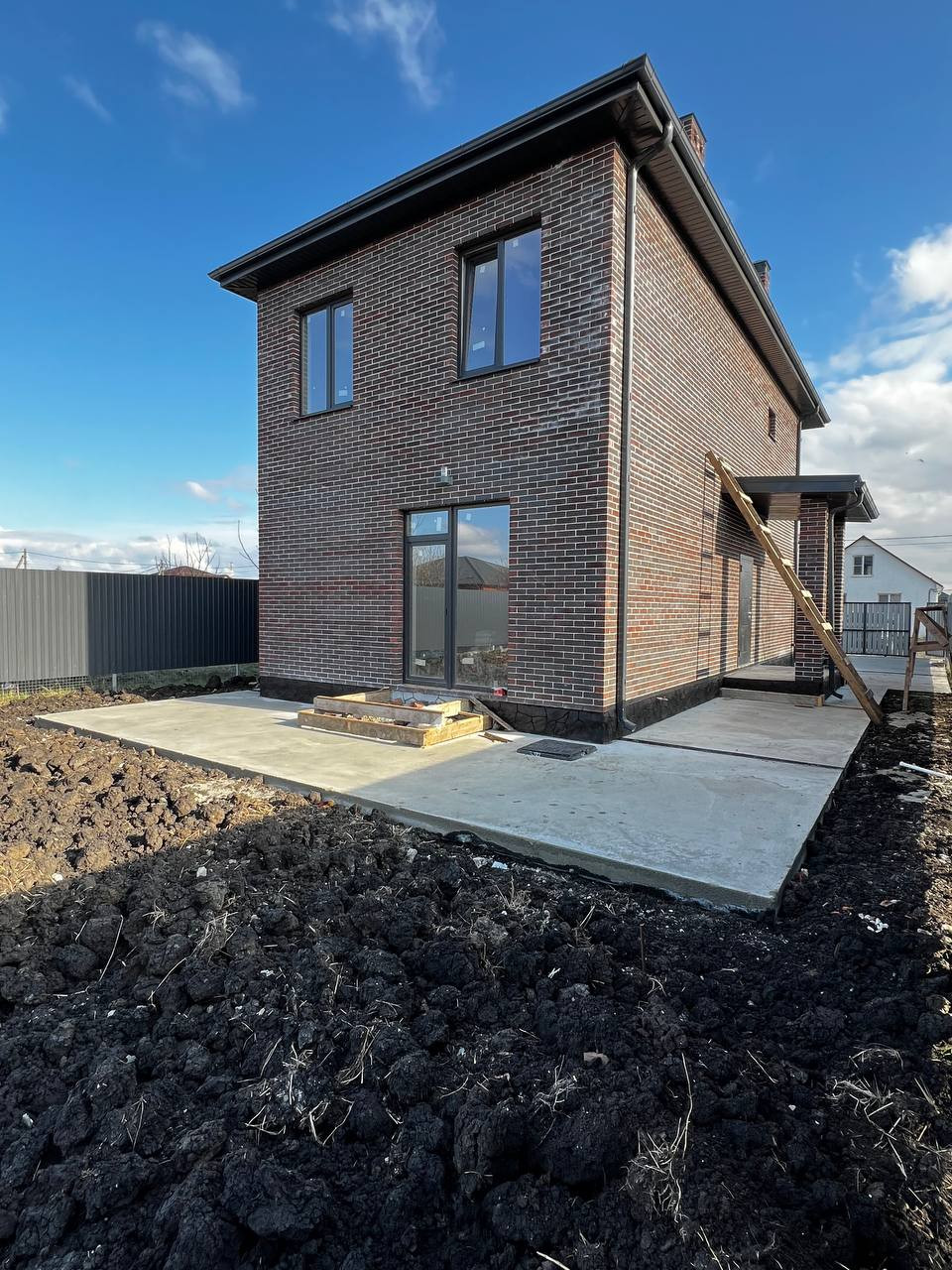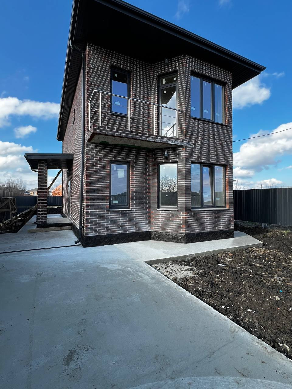 Благоустроенный двор - отмостка вокруг дома, крыльцо с колоннами, площадка под 2 авто. По периметру установлен забор, по фасаду - евроштакетник с калиткой и откатными воротами.