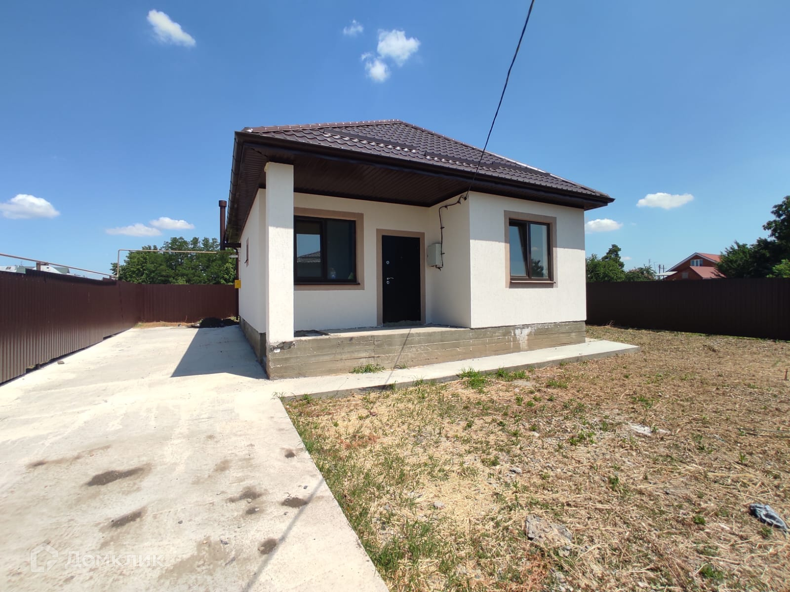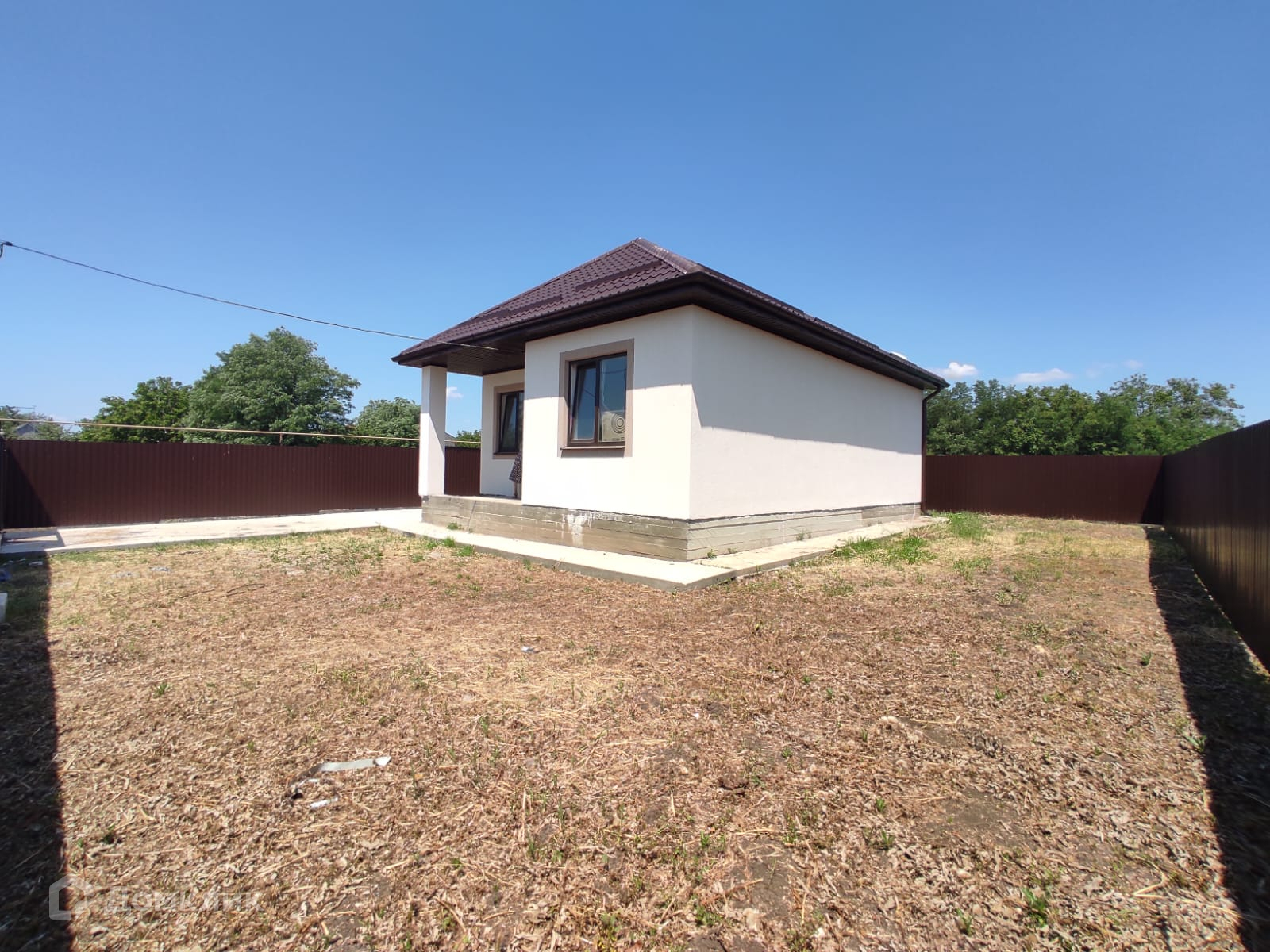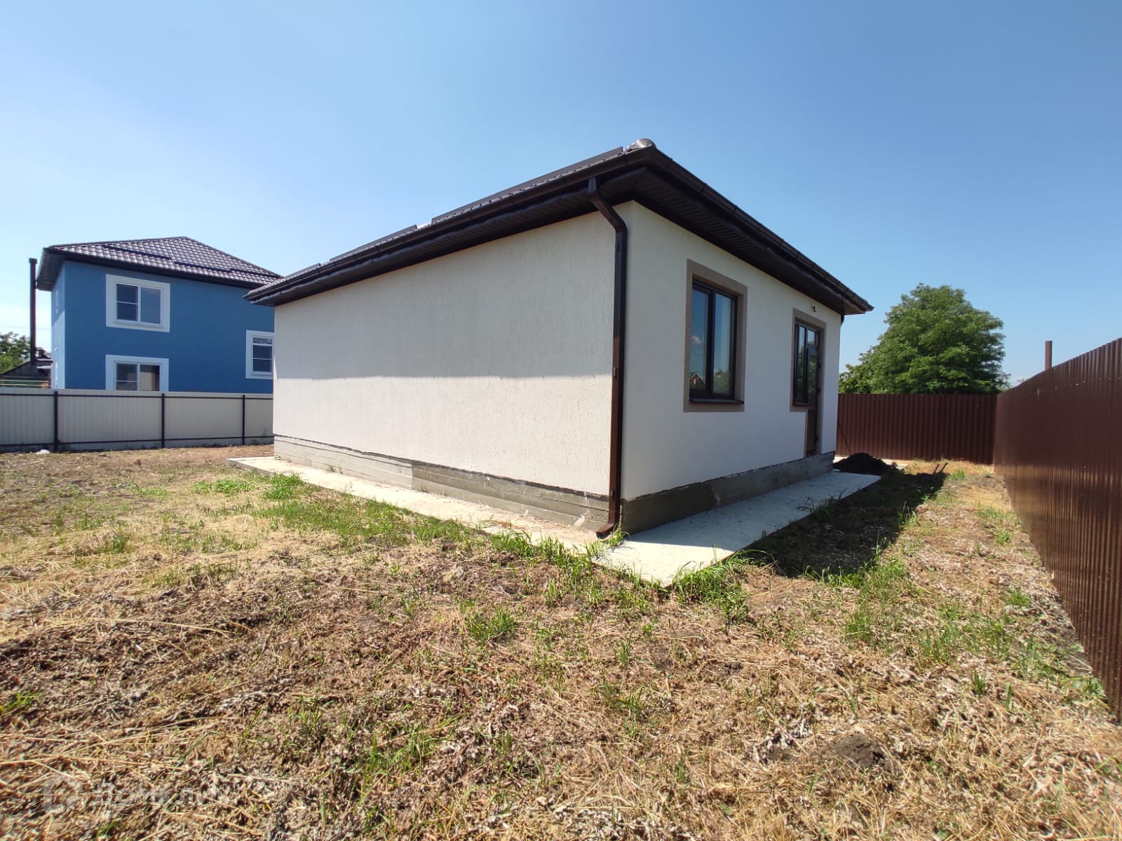 Дом из газоблока на ленточном фундаменте, крыша из металлопрофиля, окна металлопластиковые, входная дверь из прочного металла.