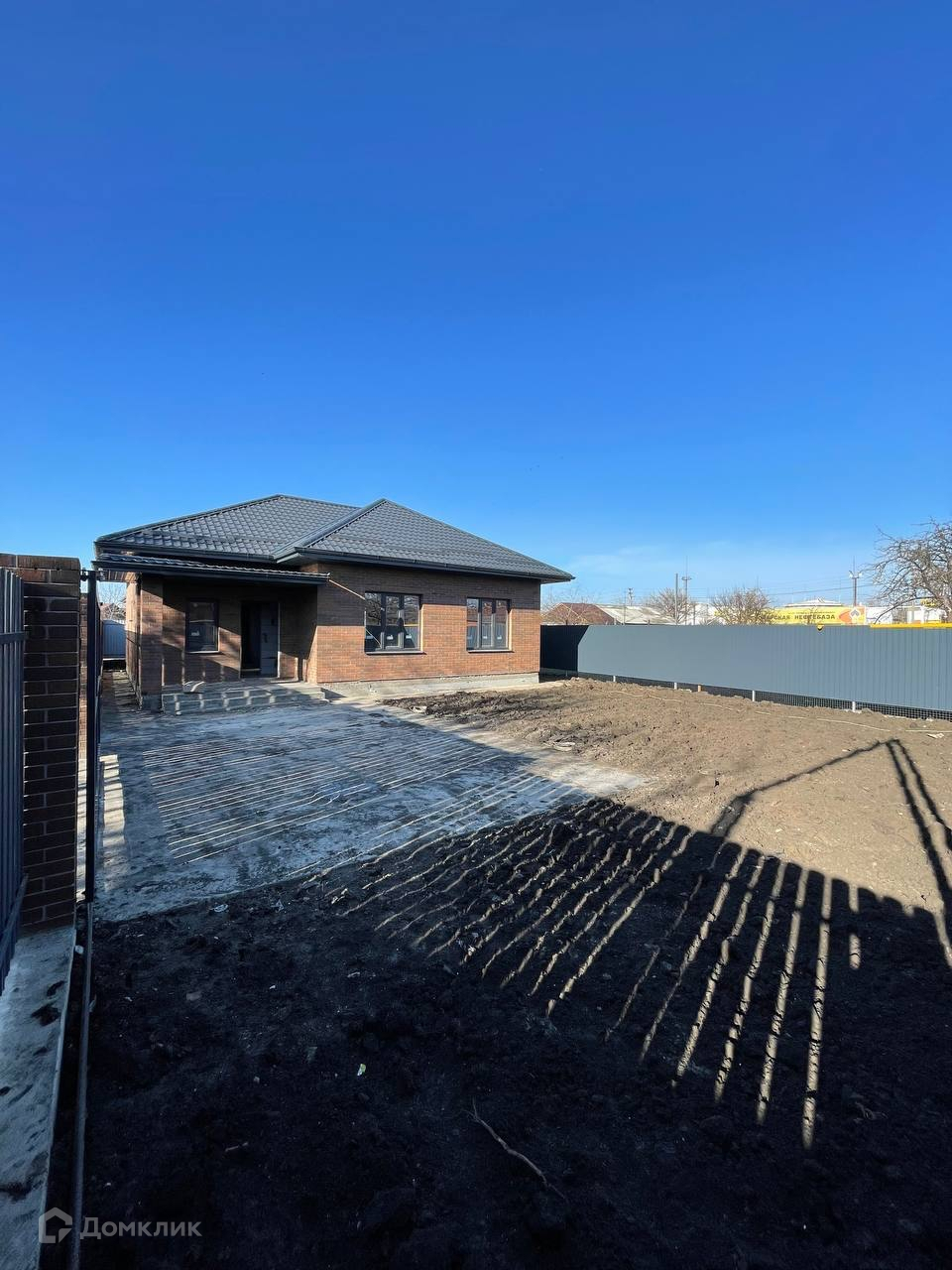 Участок огорожен забором из металлопрофиля. Фасадный забор из евроштакетника на кирпичных колоннах. Ворота откатные….Во дворе забетонирована площадка под автомобиль и отмостка вокруг дома.