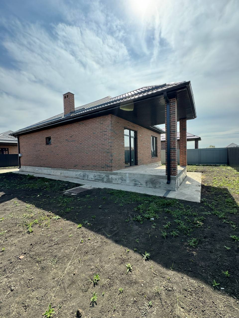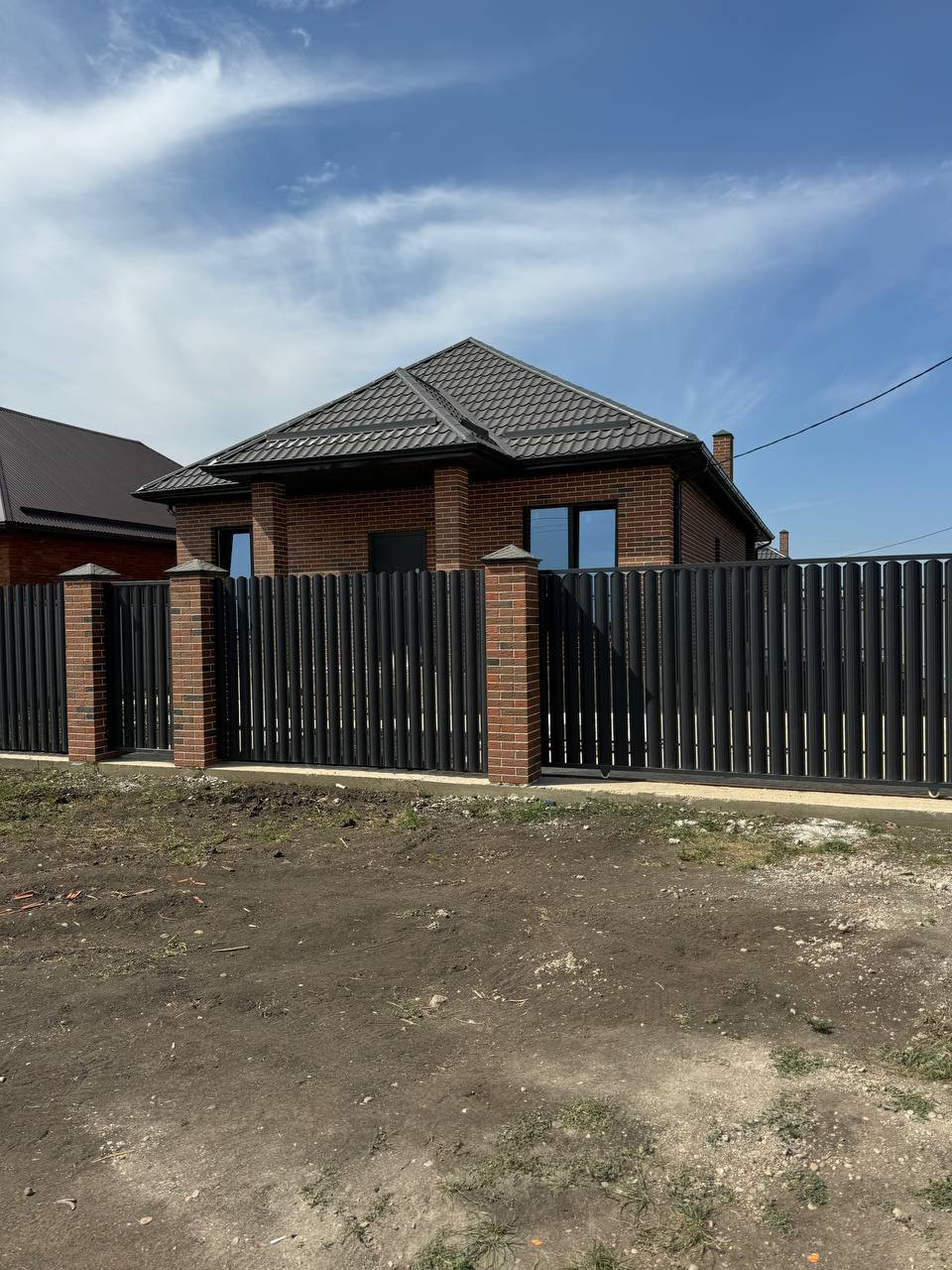 Дом выполнен из облицовочного керамического кирпича славянского завода, забутовка -паромакс, утеплитель, штукатурка под маяк. По фасадному забору идут кирпичные колоны  и евро штакетник, откатные ворота и уличное освещение.