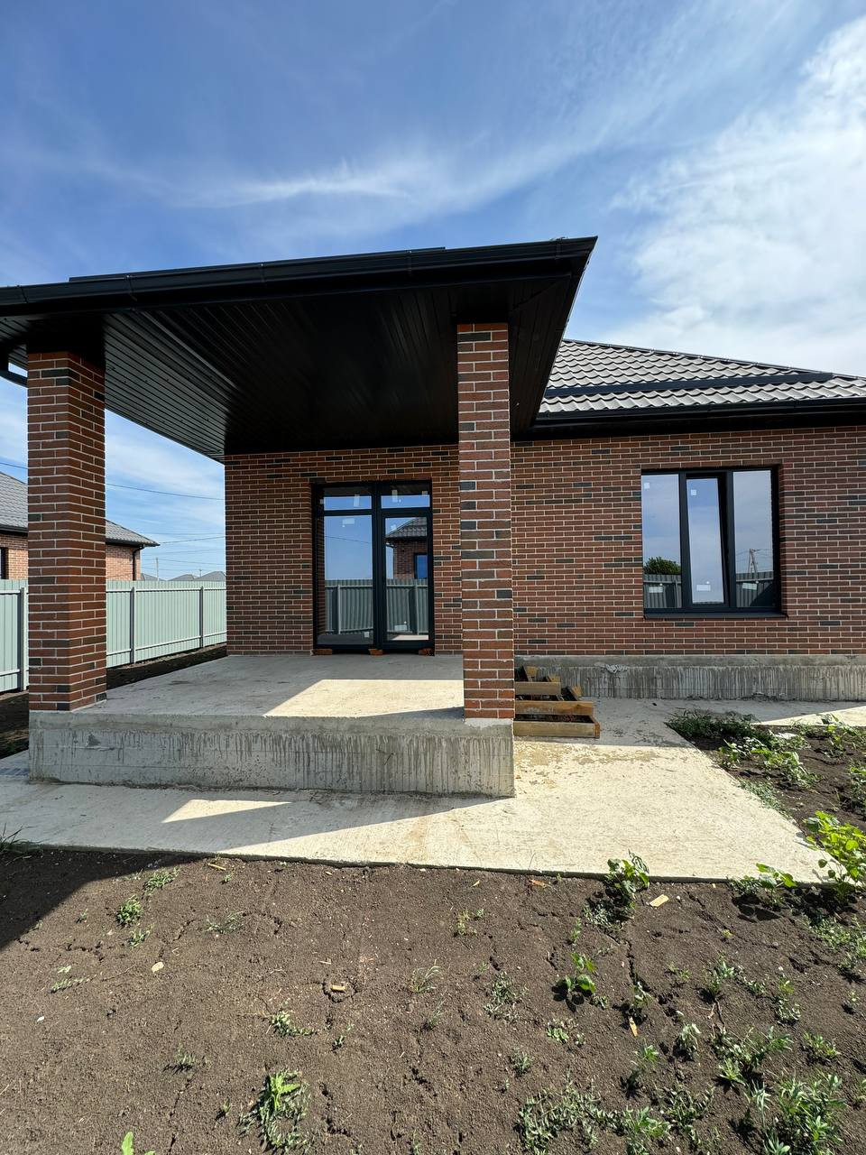 Дом выполнен из облицовочного керамического кирпича славянского завода, забутовка -паромакс, утеплитель, штукатурка под маяк. По фасадному забору идут кирпичные колоны  и евро штакетник, откатные ворота и уличное освещение.