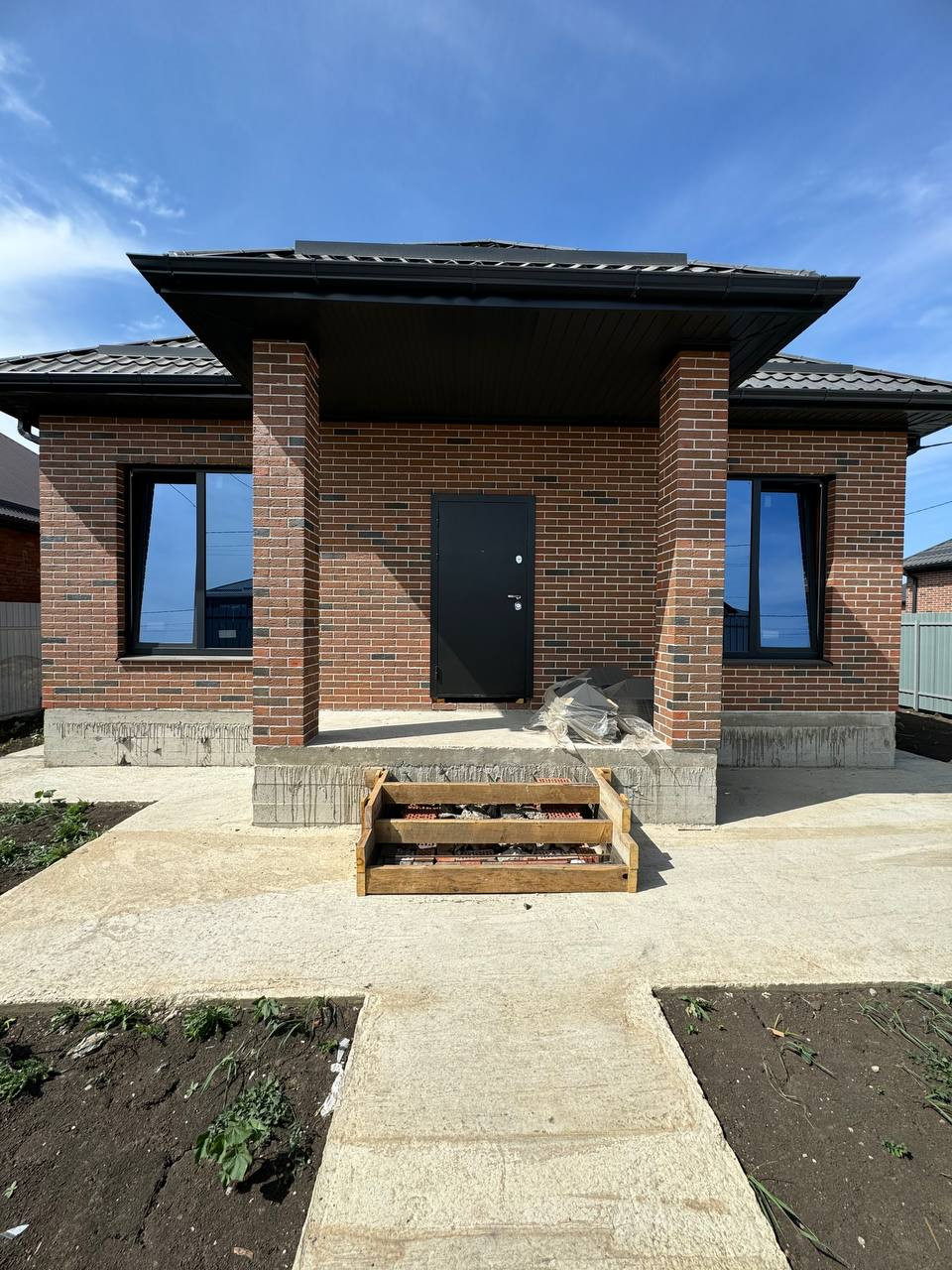 Дом выполнен из облицовочного керамического кирпича славянского завода, забутовка -паромакс, утеплитель, штукатурка под маяк. По фасадному забору идут кирпичные колоны  и евро штакетник, откатные ворота и уличное освещение.