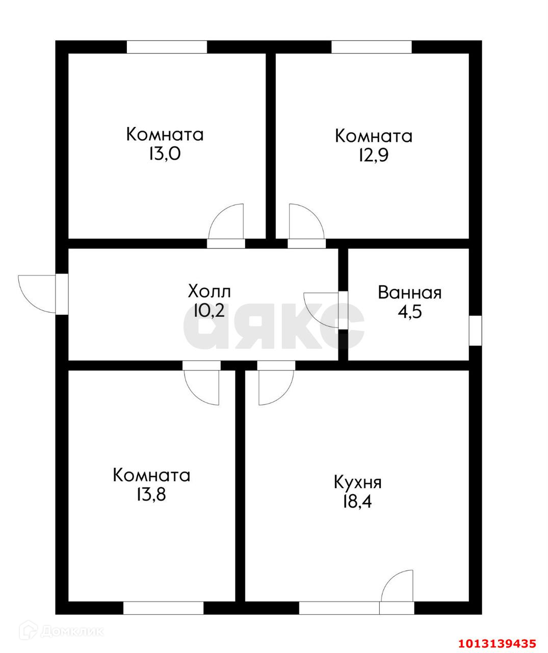 Планировка просторная кухня 18,4м2 с выходом на улицу! Жилые комнаты 13,8м2 и две комнаты по 13м". Совмещенный санузел 4,5м2!