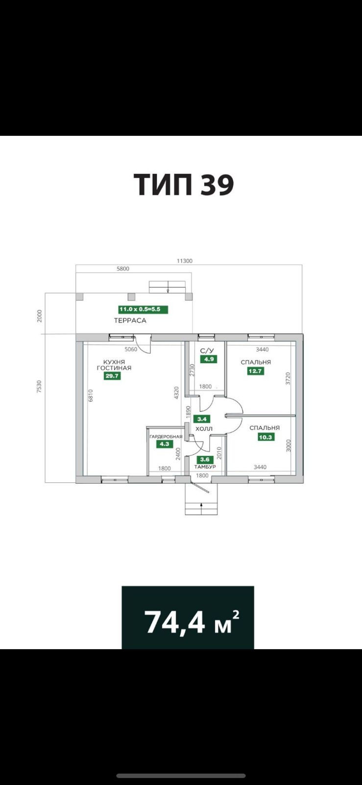 Общая площадь 74.4 м2