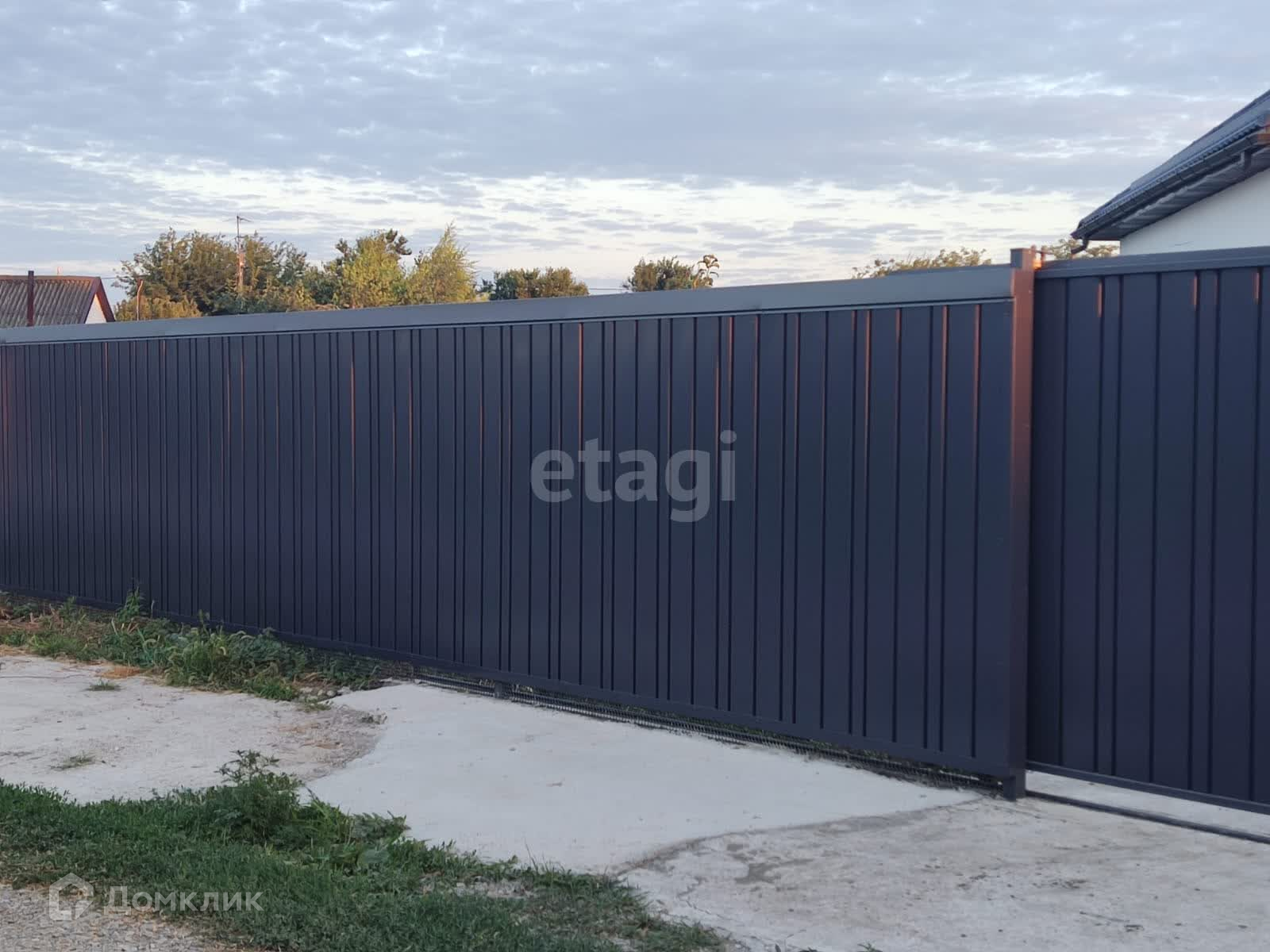 Забор выполнен из металлического штакетника, калитка, откатные ворота 4м, по периметру от соседей металлопрофиль. Так же забетонированный двор, парковка под две машины. Сделан навес.