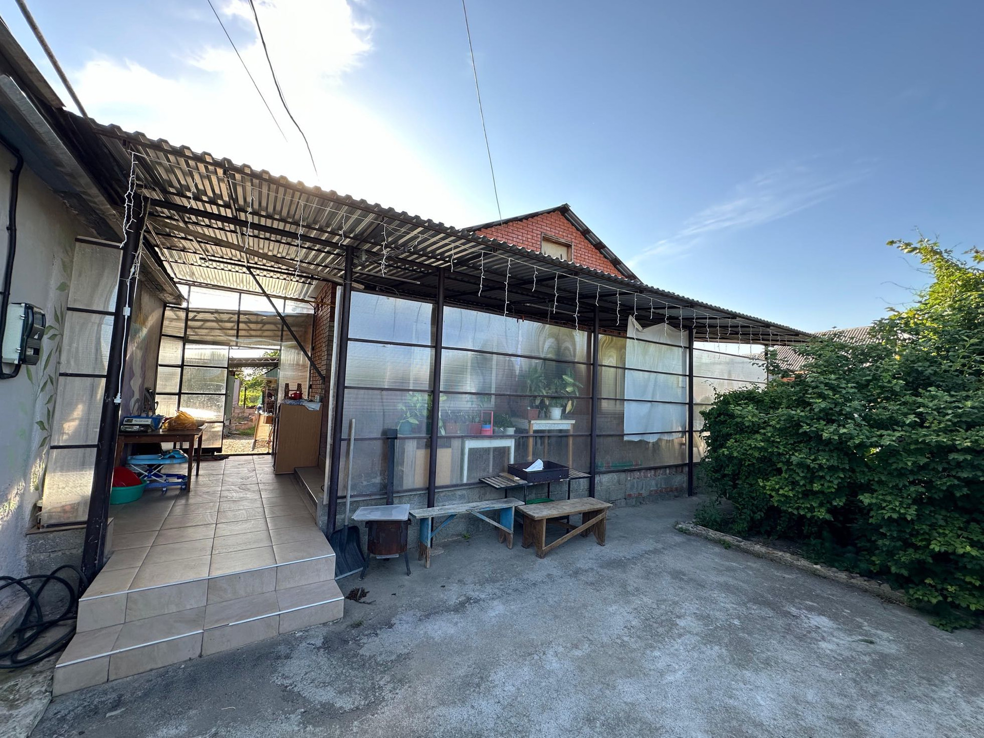 Терраса с навесом, напольное покрытие плитка, закрыта поликарбонатом, освещение (30 кв.м)