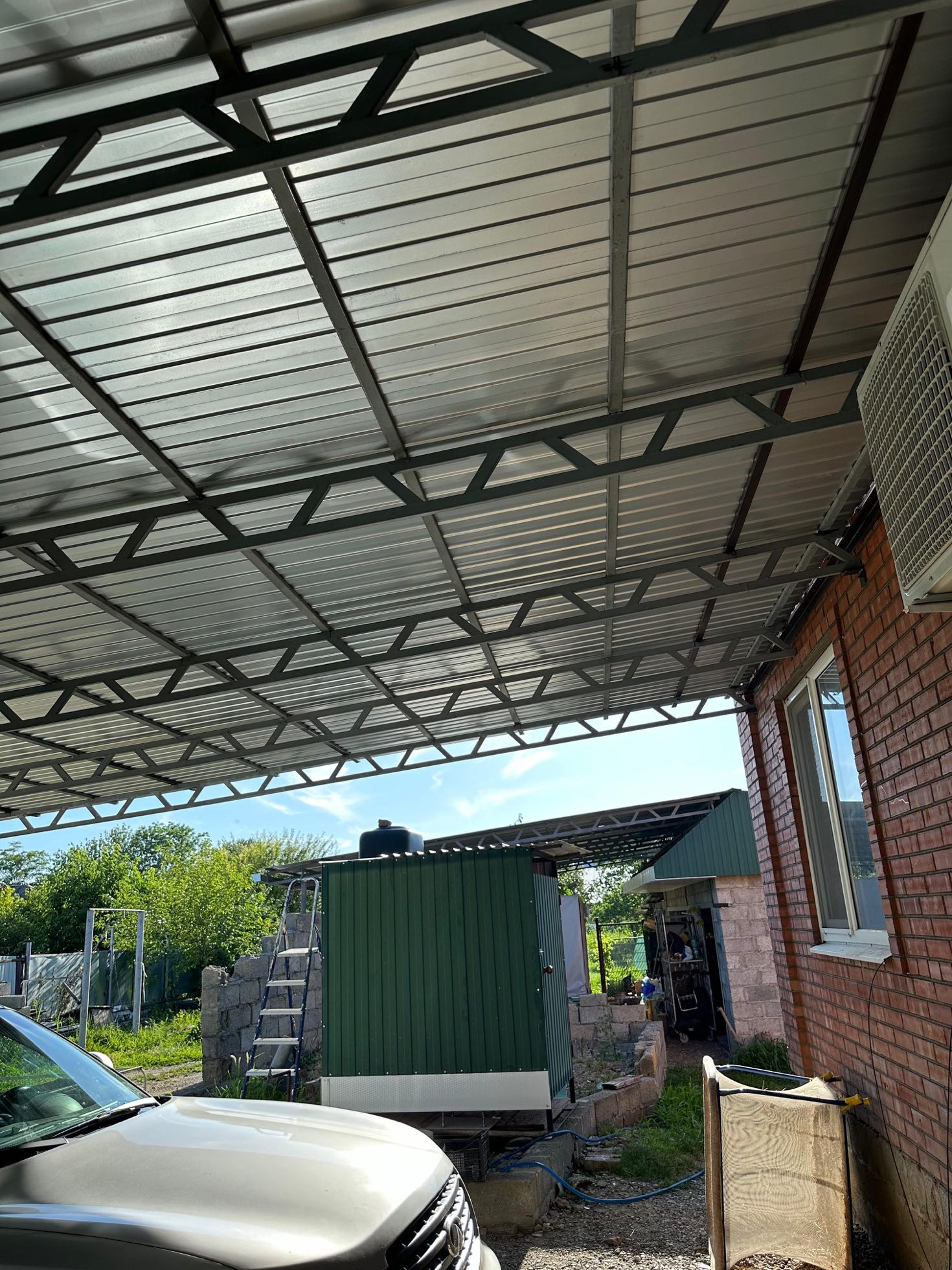 Большой двор с двумя навесами на 3 автомобиля.