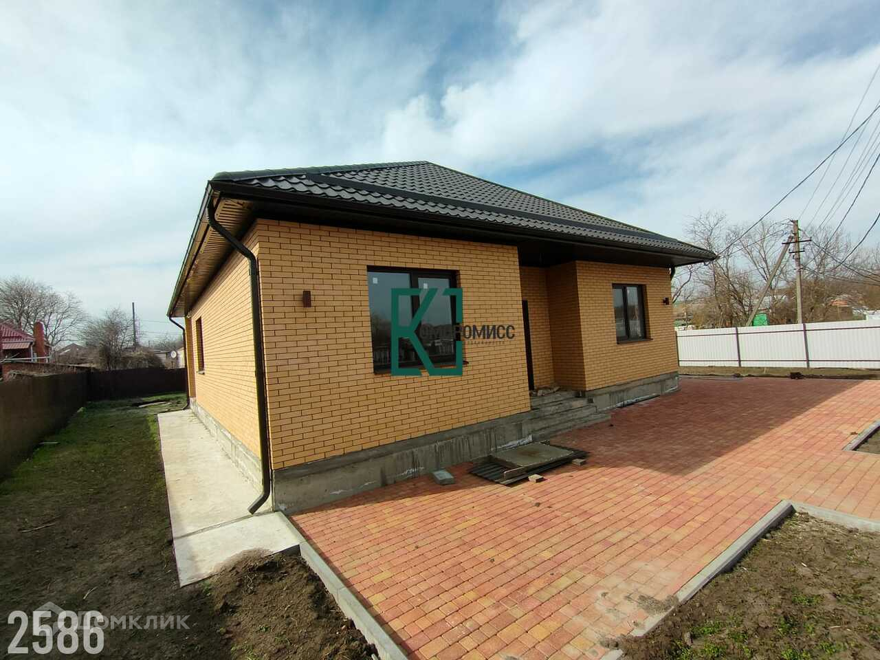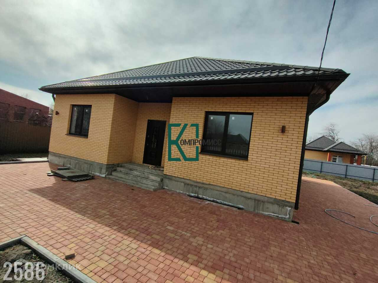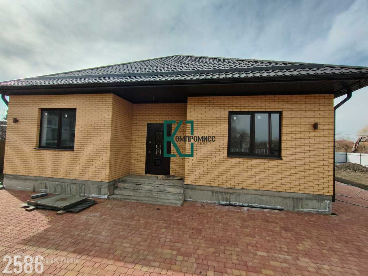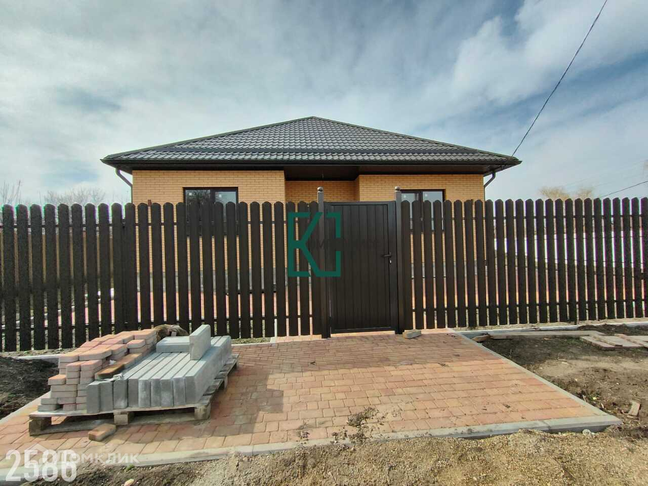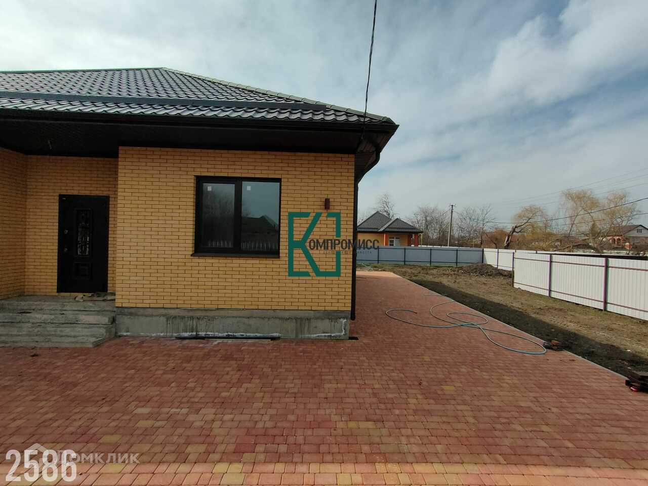 Дом построен из газоблока, облицован кирпичом, вентиляционный зазор- 4 см. Крыша- металлическая черепица, бетонная отмостка. Двор- плитка.