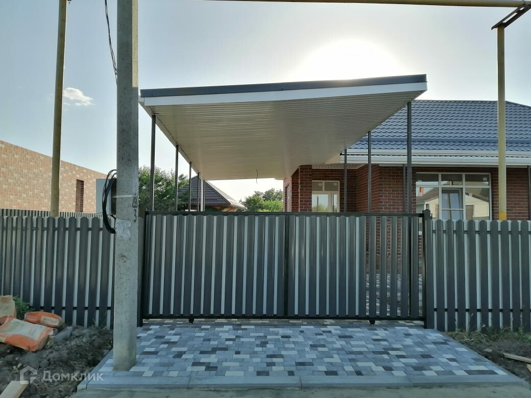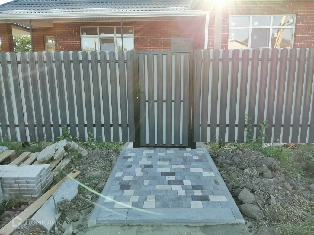 Благоустройство двора: фасадный забор - двухсторонний штакетник, забор по периметру из профлиста на металлическом каркасе, навес и тротуарная плитка.