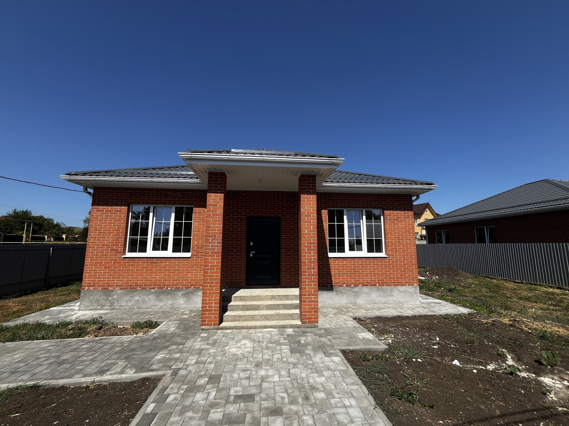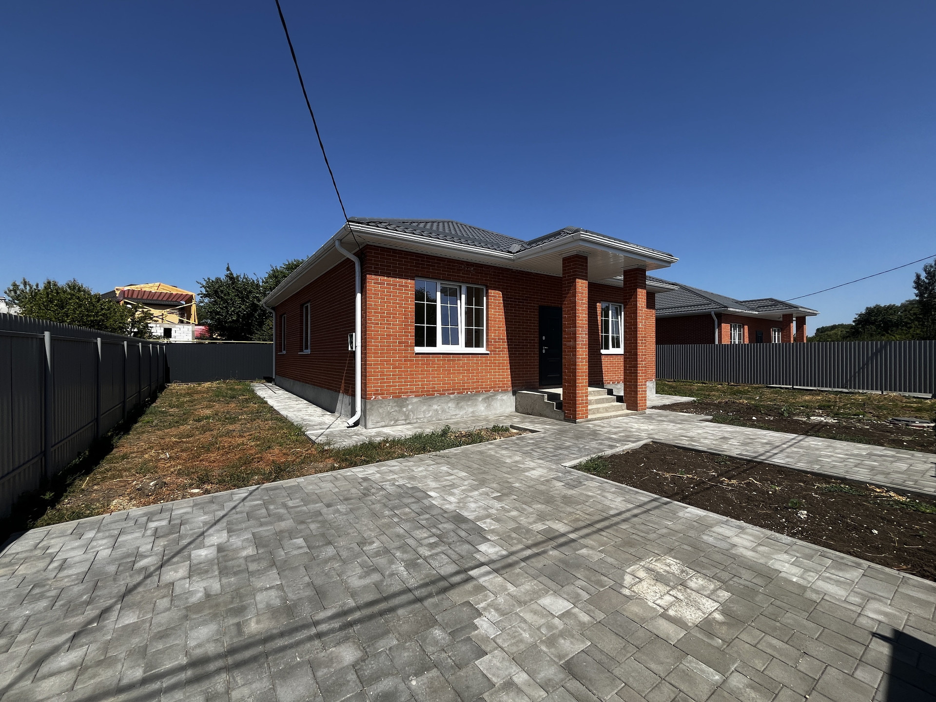 Двор забетонирован, выложен плиткой, отмостка, парковочные места для автомобилей.