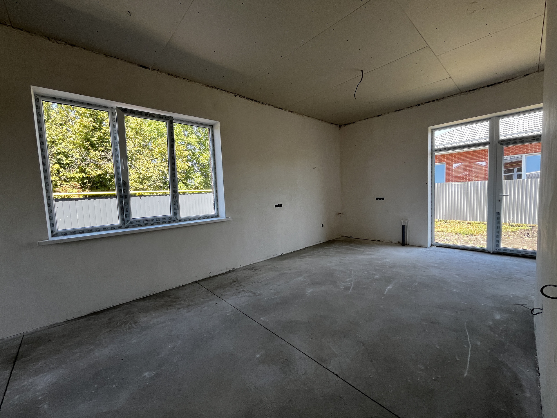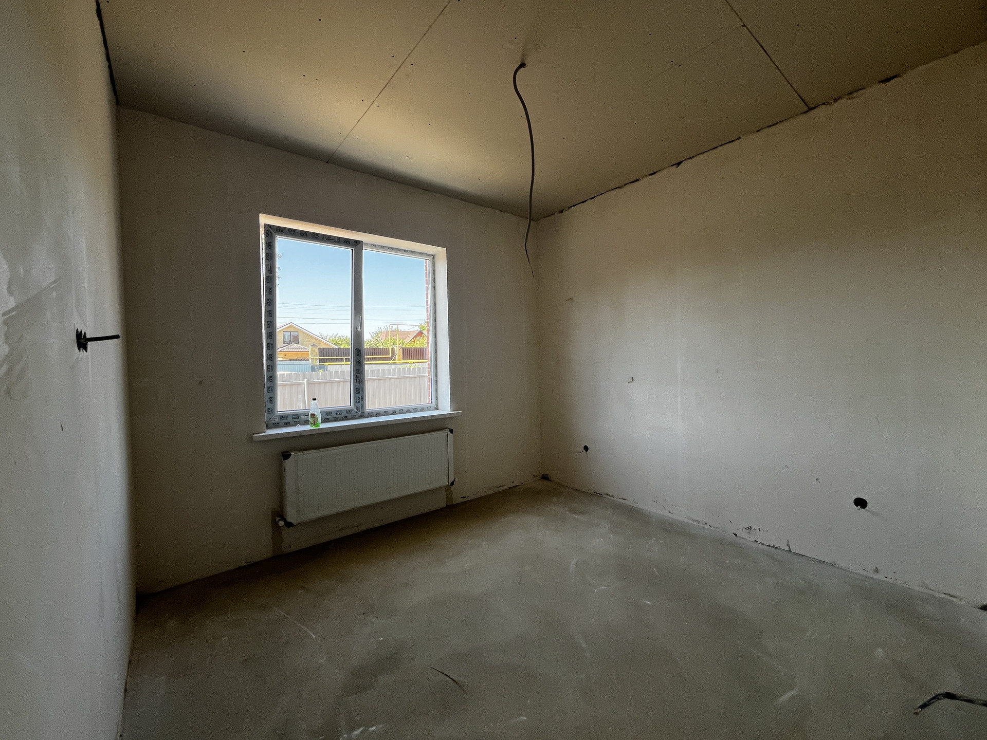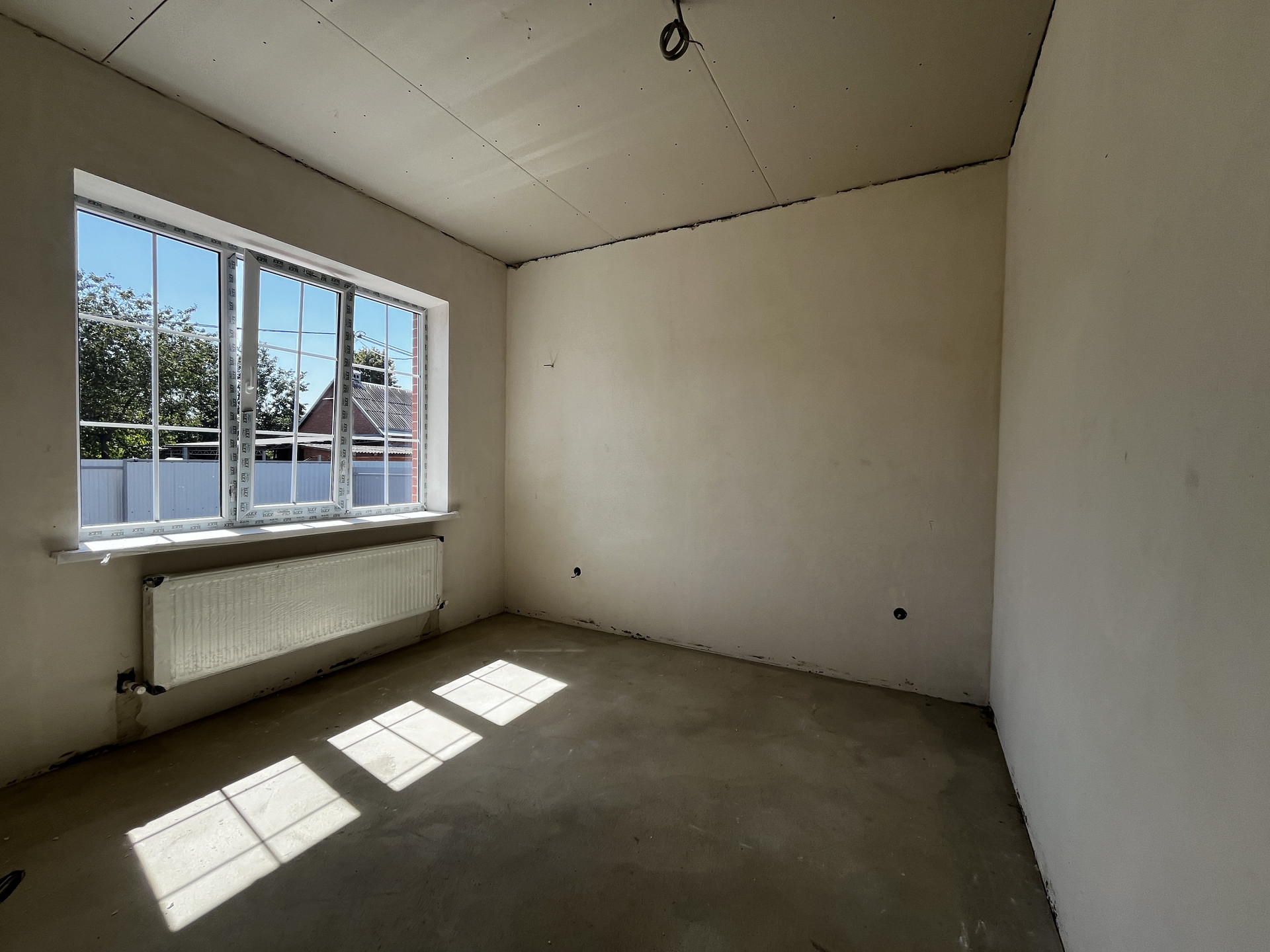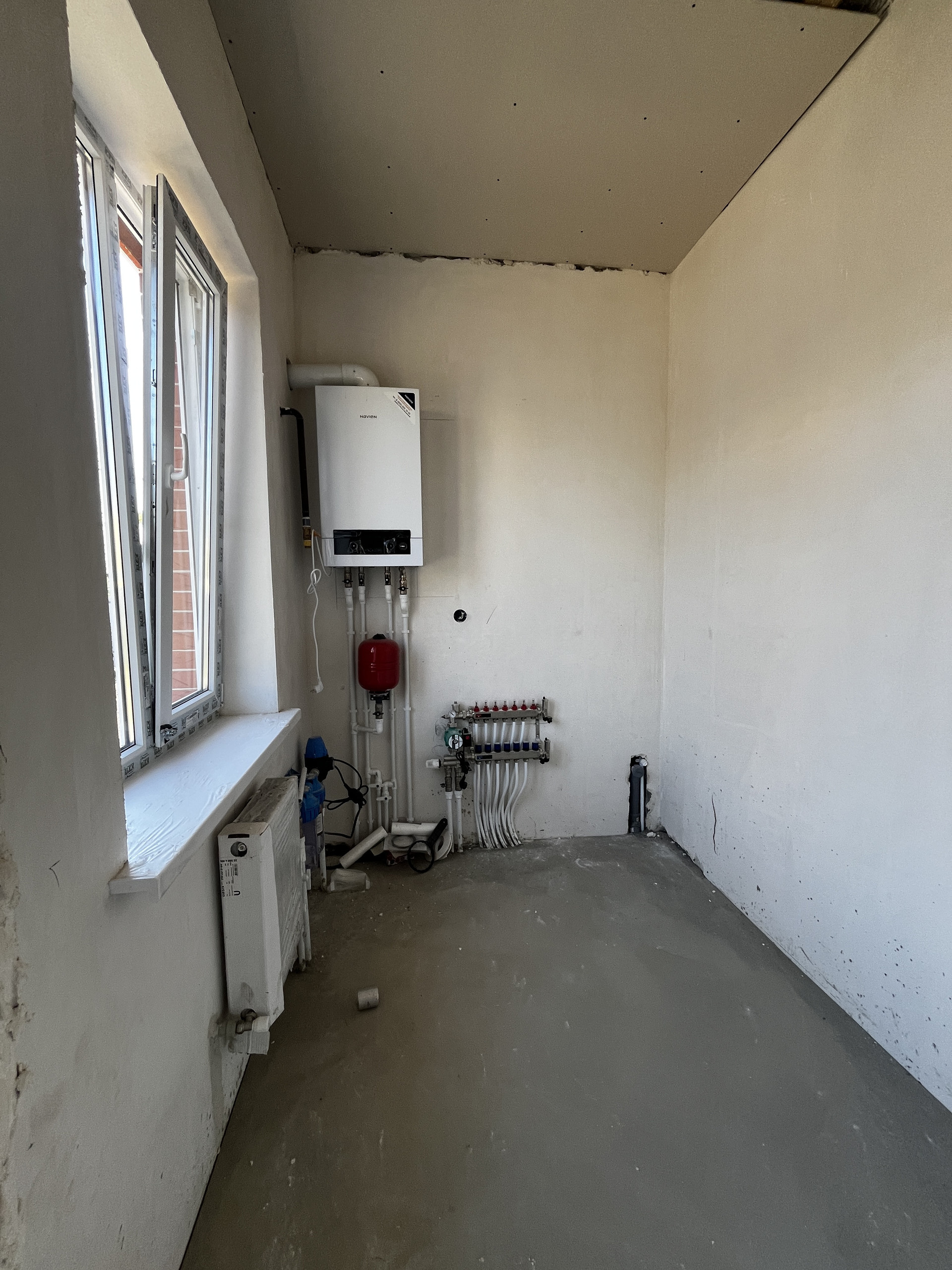 Дом — в предчистовой отделке: стяжка пола, теплый пол, штукатурка, разводка коммуникаций, радиаторы отопления, двухконтурный котел.