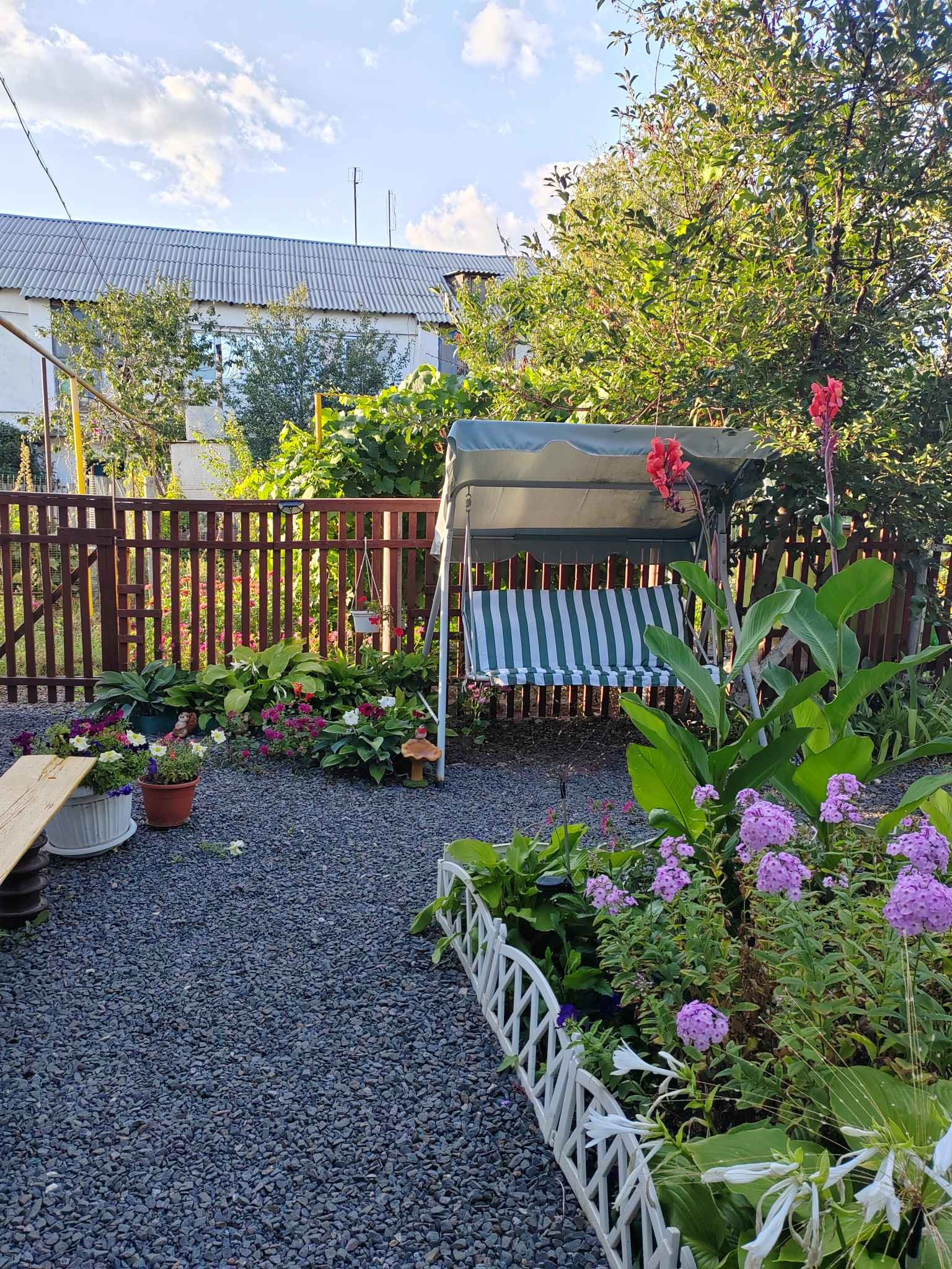 Имеется ухоженный участок, с молодыми деревьями 3-5 лет и кустарниками. Есть гараж, можно привести в порядок или установить новый, так же имеются хозпостройки и место для парковки.