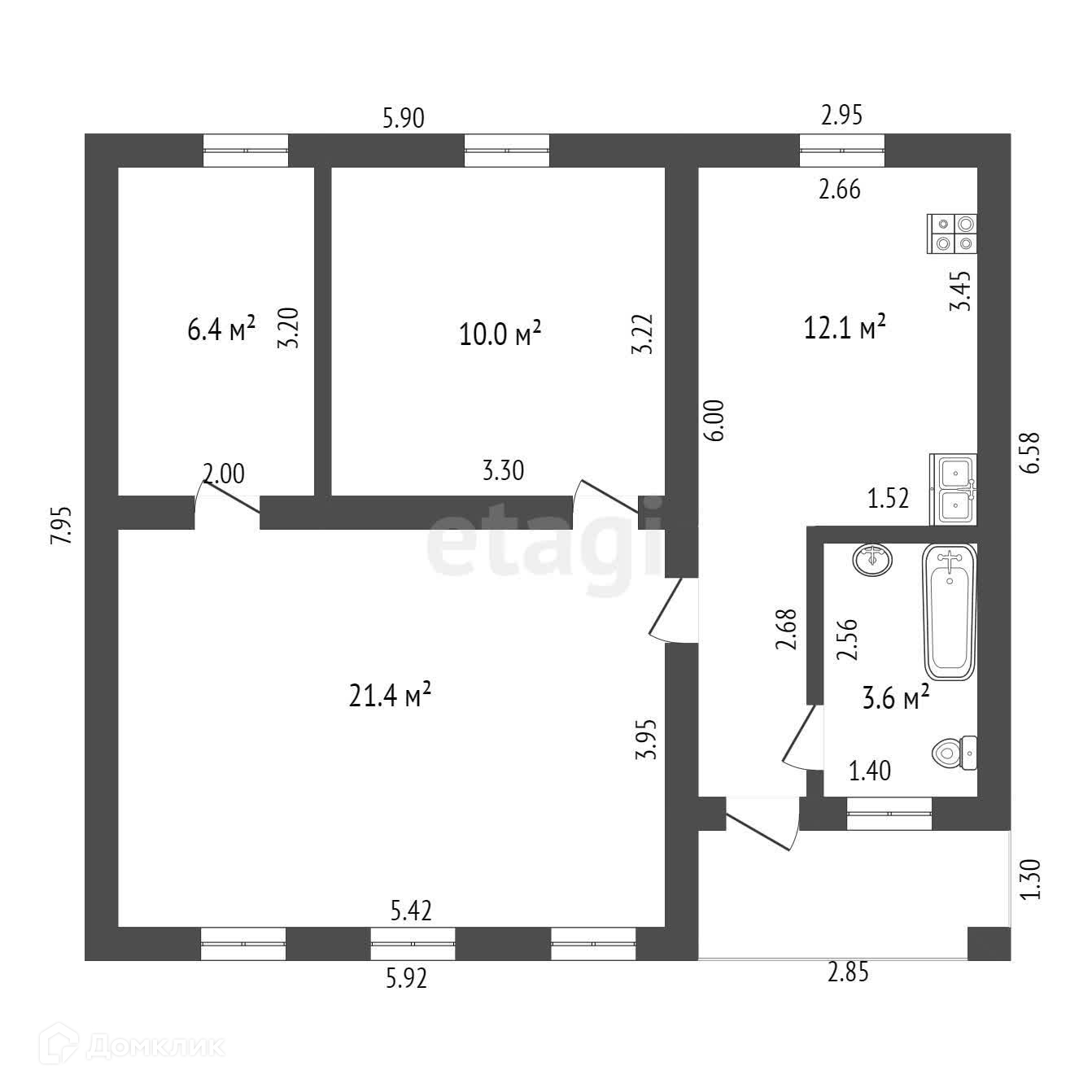 В доме всего три комнаты, две спальни 6,4 кв.м., 10,6 кв.м. и зал 21,4 кв.м.. Кухня 12,1 кв.м. санузел совмещен.