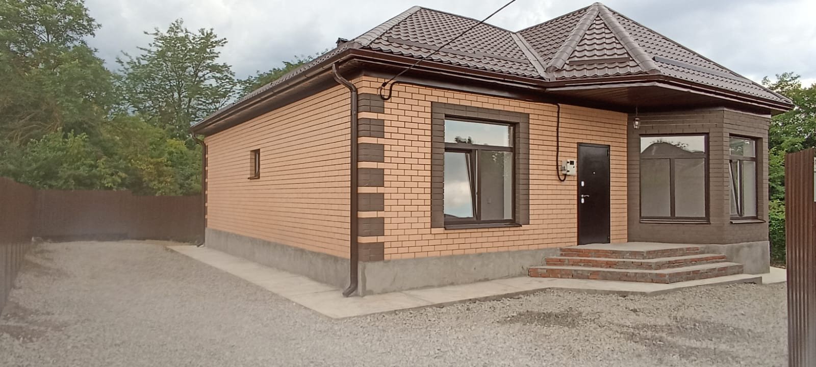 Продам новый одноэтажный, полностью кирпичный дом, общ. пл. 103кв.м. в станице Северской Краснодарского края, на асфальтированной улице. З/у 5 соток, ограждён металлическим забором. В доме три изолированные спальни: 16кв.м., 14кв.м., 14кв.м., кухня-гостиная с дополнительным выходом около 30кв.м. Два санузла. Высота потолков 3м/п. Газ, эл-во 15кВт, водопровод центральный, канализация септик. Тёплые полы, двухконтурный котёл. Предчистовая отделка. Рядом парк Победы, детская площадка.