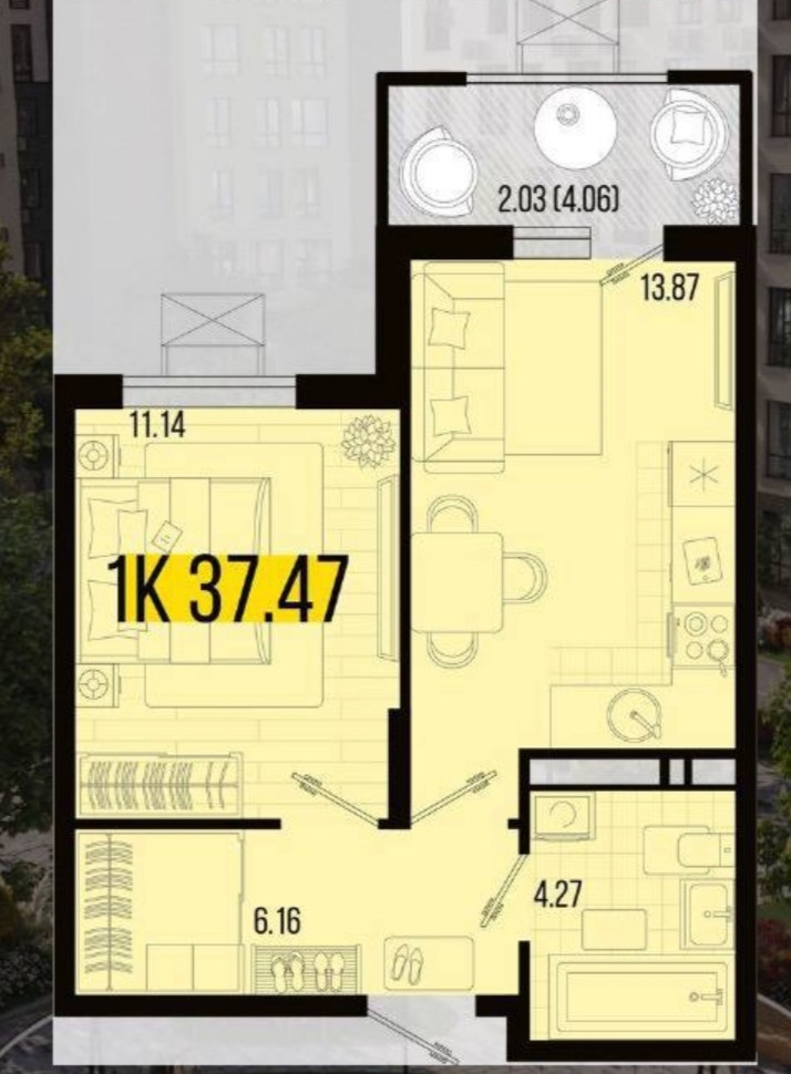 Площадь студии 28,2 кв.м.
