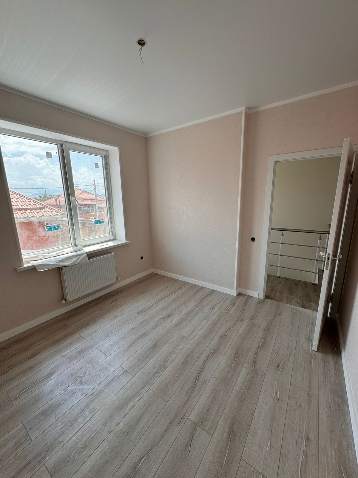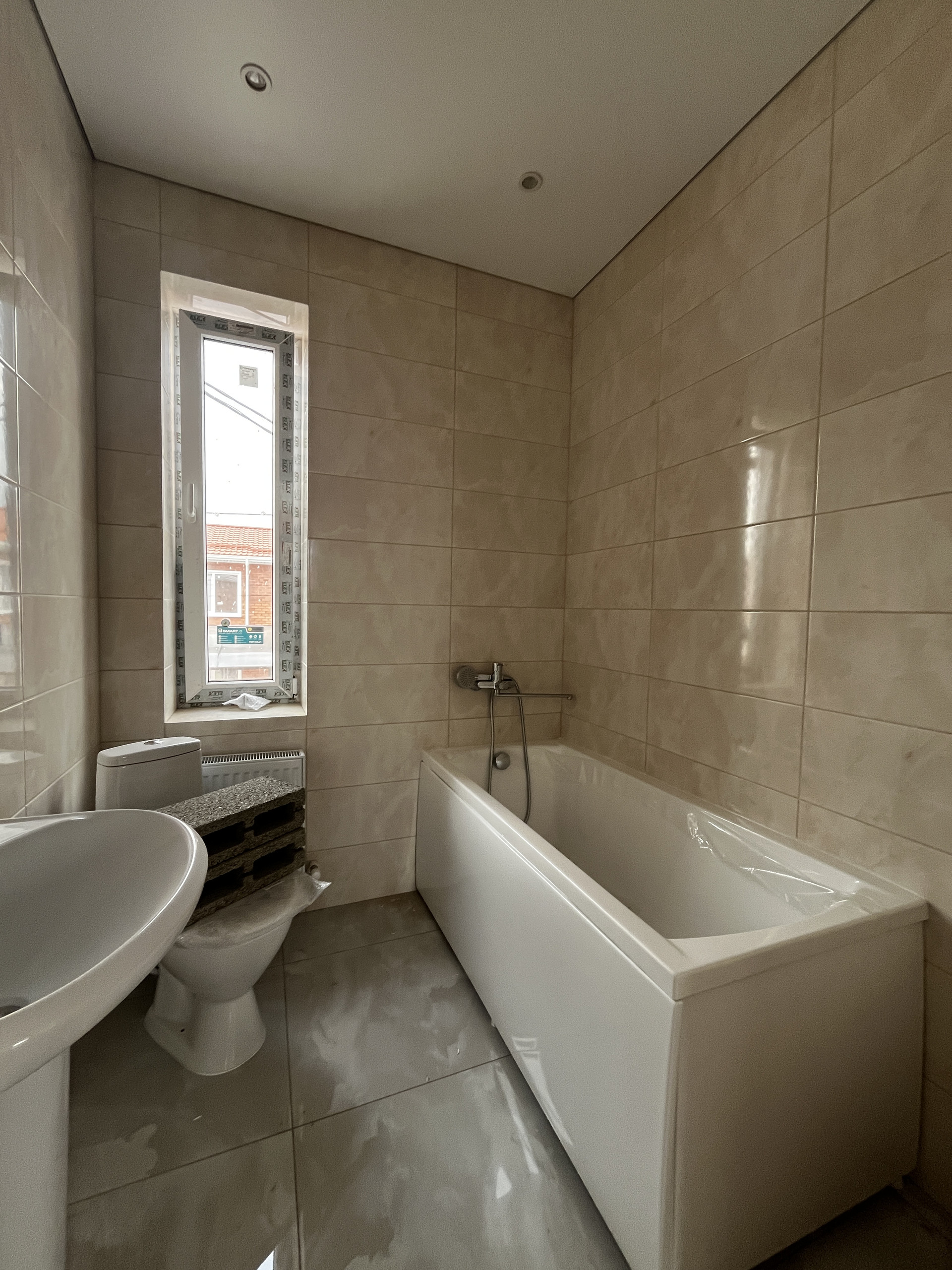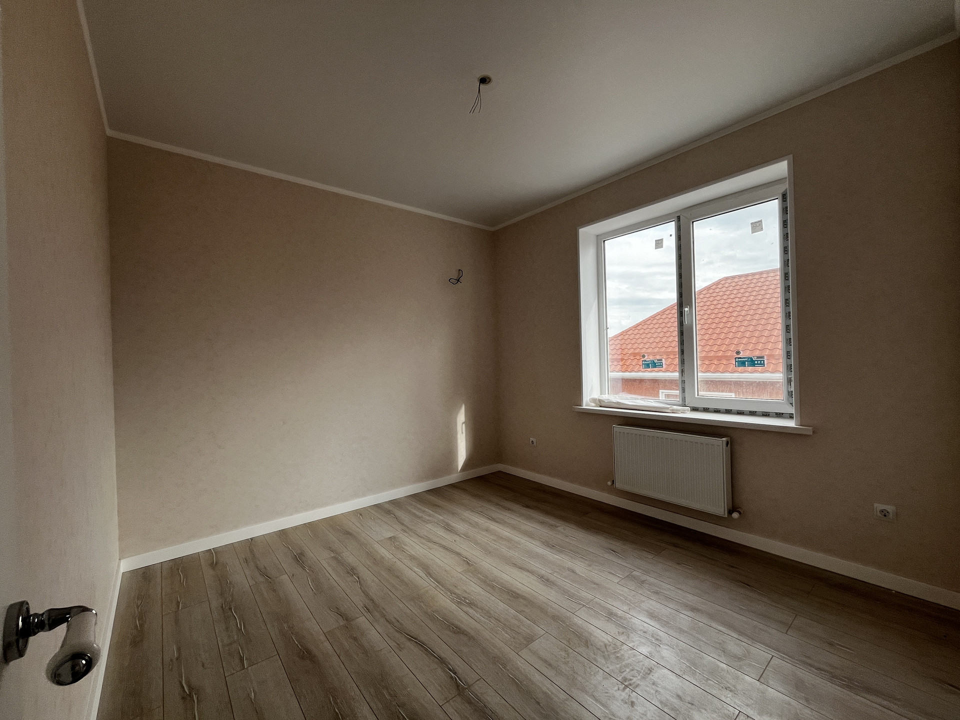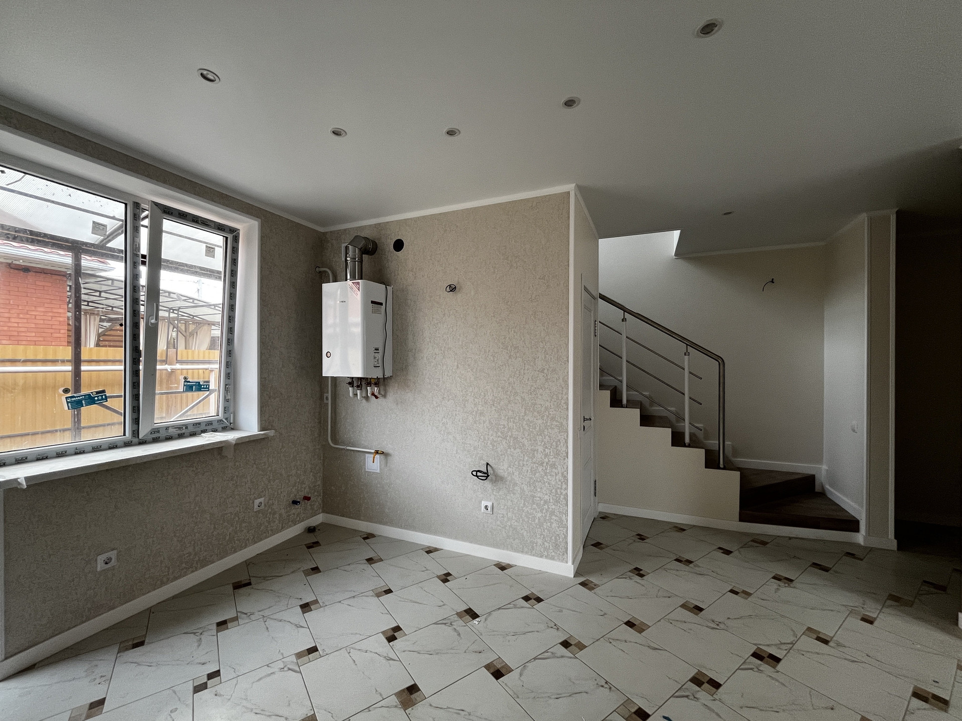 Таунхаус — в предчистовой отделке: разводка электричества, штукатурка под обои, натяжной потолок, теплый пол — на первом  этаже, газовый котел.