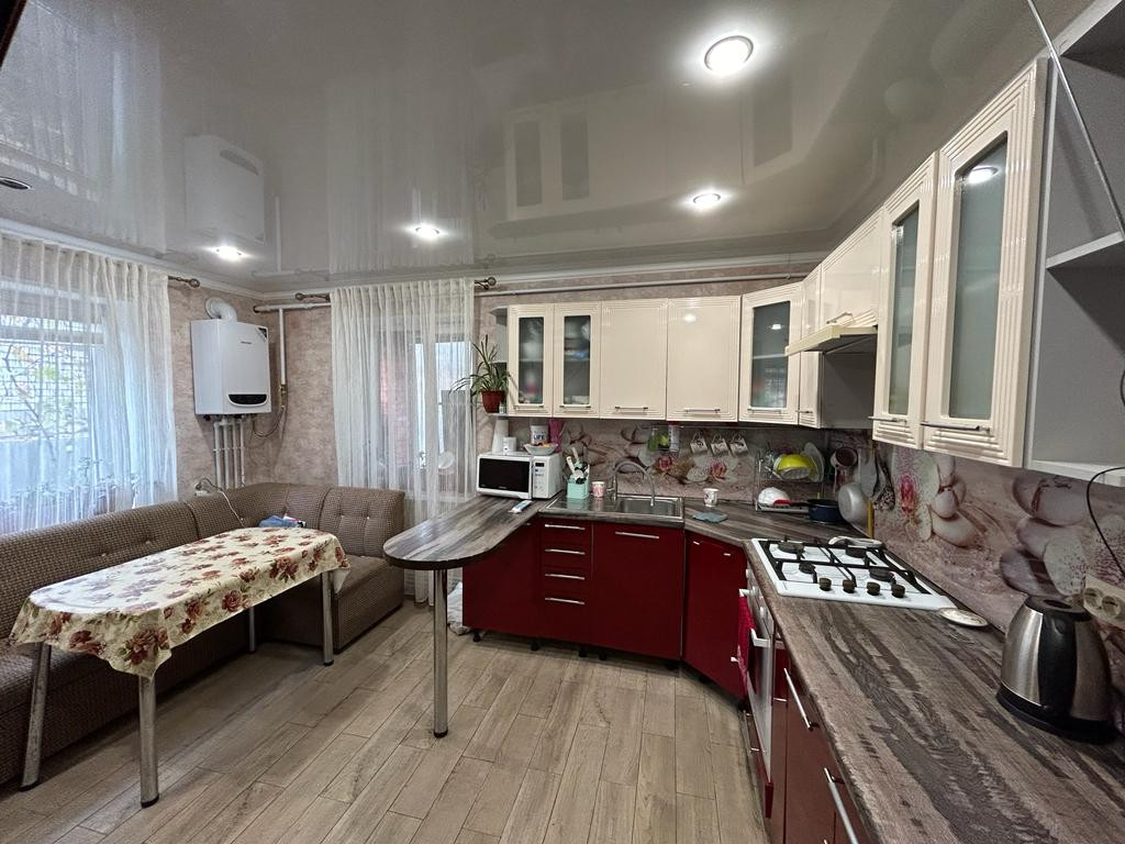 Хороший ,уютный двухэтажный дом 103,7 квадратных метра , на 3.21 сотках земли. Впереди дома имеется забетонированная площадка под авто , откатные ворота и внутри двора еще одно парковочное место под еще одно авто. Строение состоит из двух этажей : на первом расположена спальня, просторная прихожая, ванная комната с санузлом( совмещен), кухня -столовая, с нее подъем по лестнице на второй этаж, там имеется две комнаты с чистовой отделкой, которым необходим ремонт, и еще одно подсобное помещение так же без ремонта. На задней части двора имеется хороший палисадник с большим наименованием кустов ягодных насаждений, имеются хоз. постройки . На территории из коммуникаций: -электричество -вода -два -ГАЗ септик на 2 кольца Уютный приятный дом . Заинтересованных звоните , расскажем покажем! Новое отопление , новый котел!