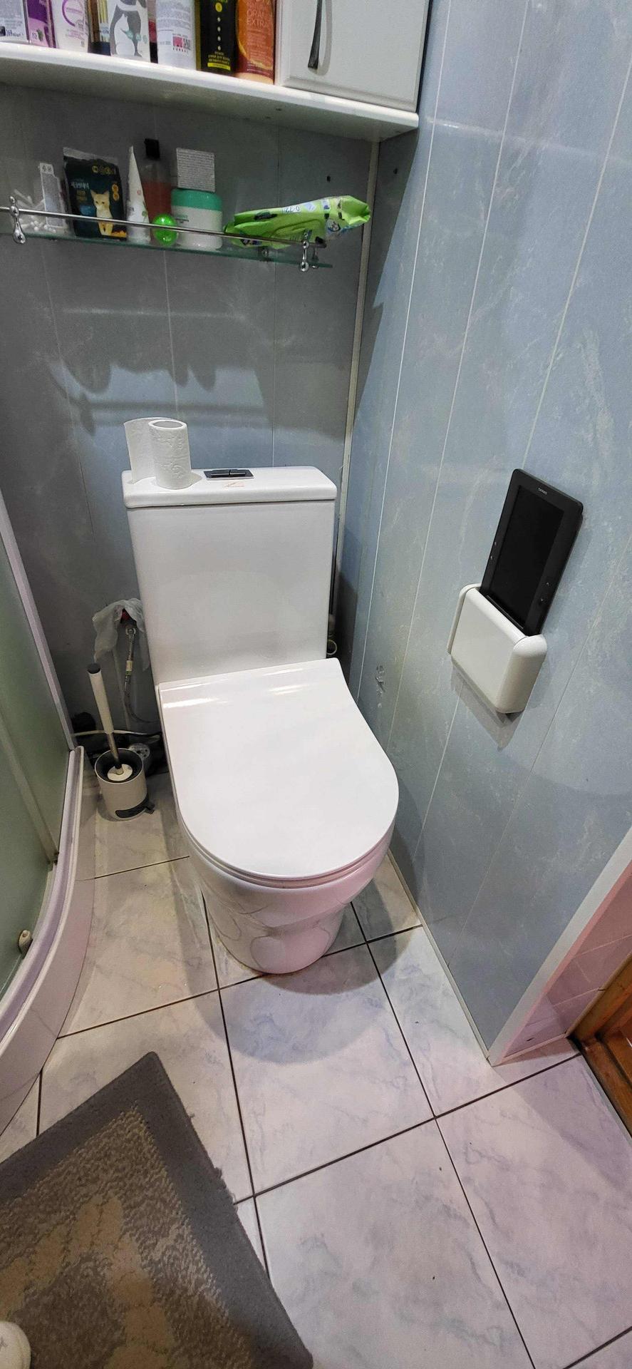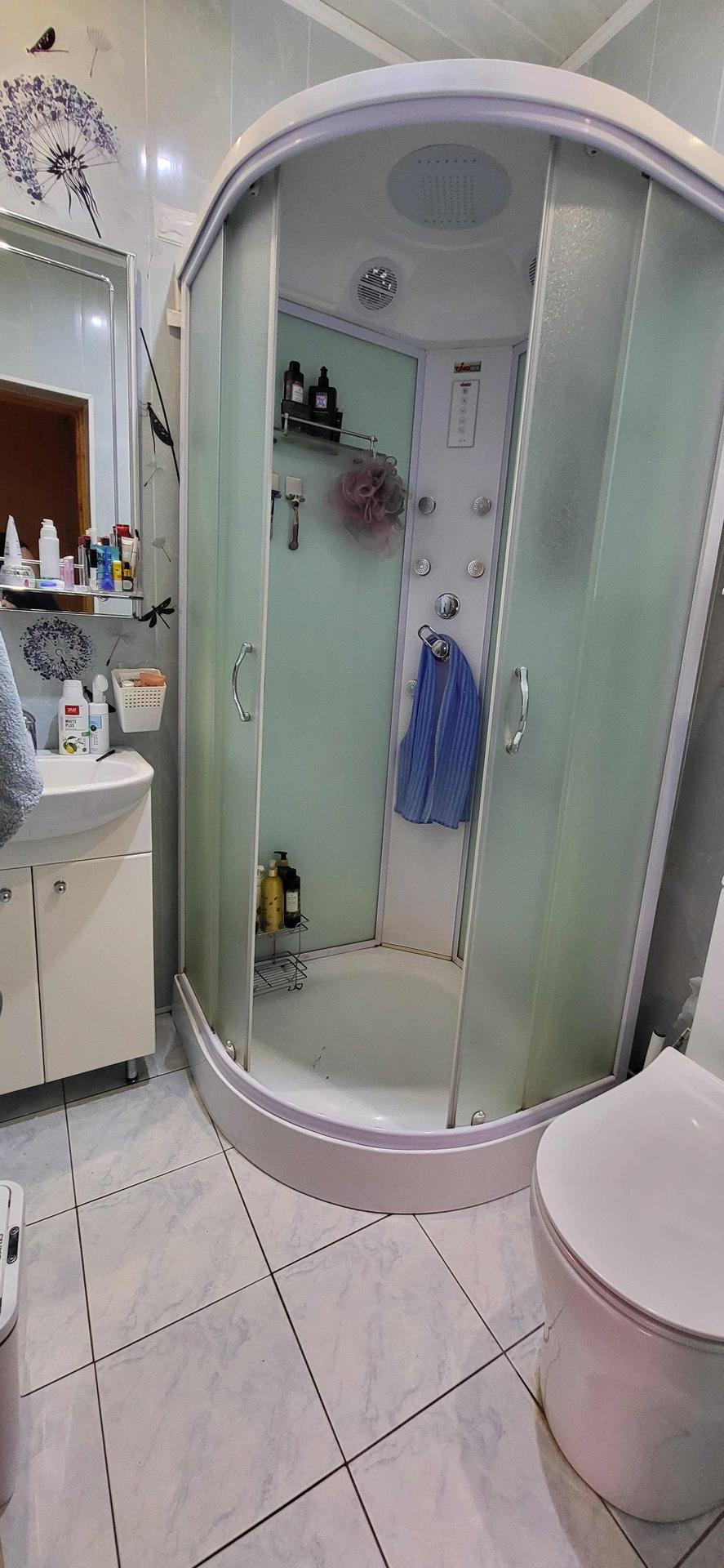В ванной стоит финская душевая кабина с подсветкой и радио. Новый, дорогой унитаз монолит, с микролифтом и быстросъемным сиденьем.