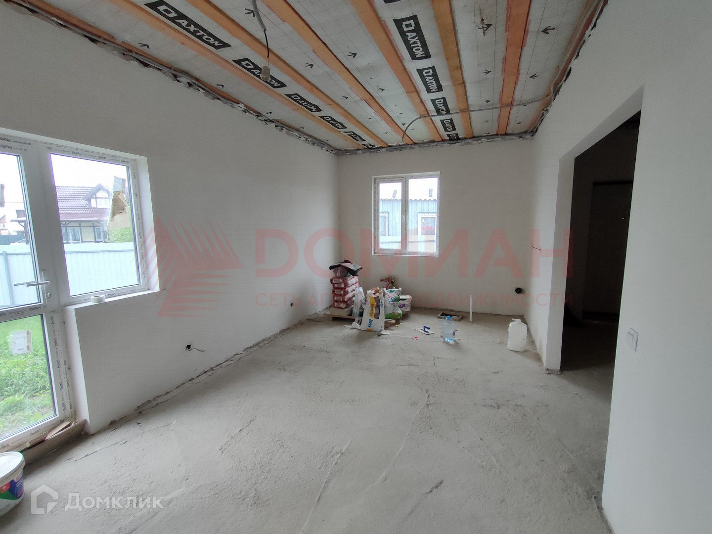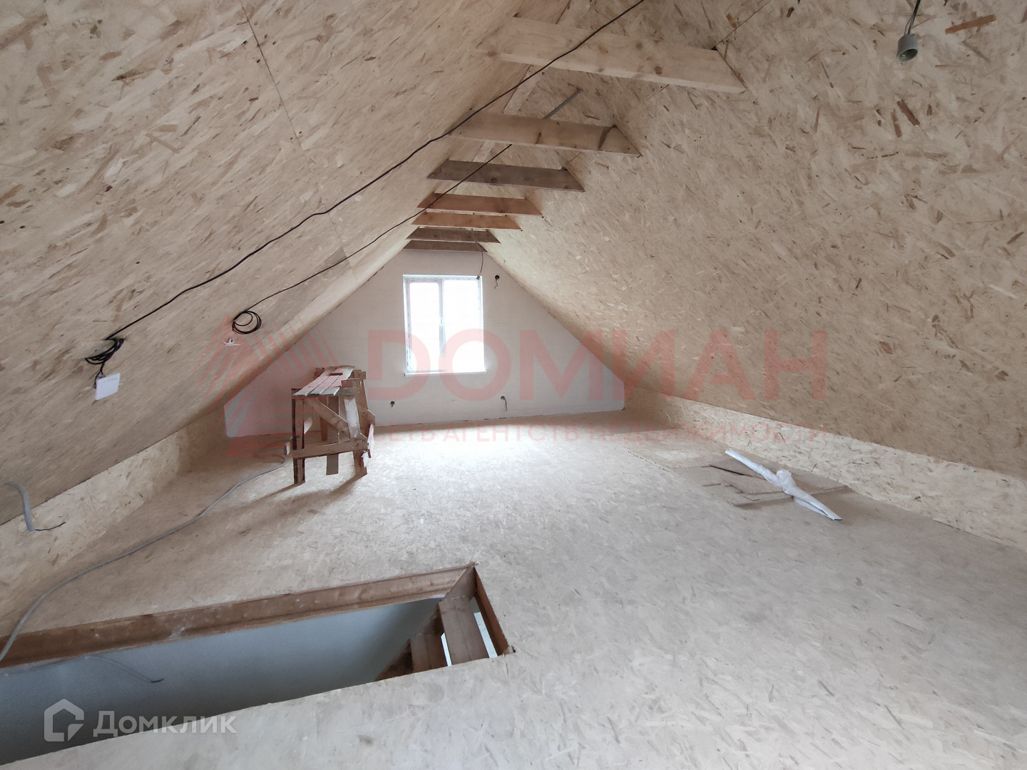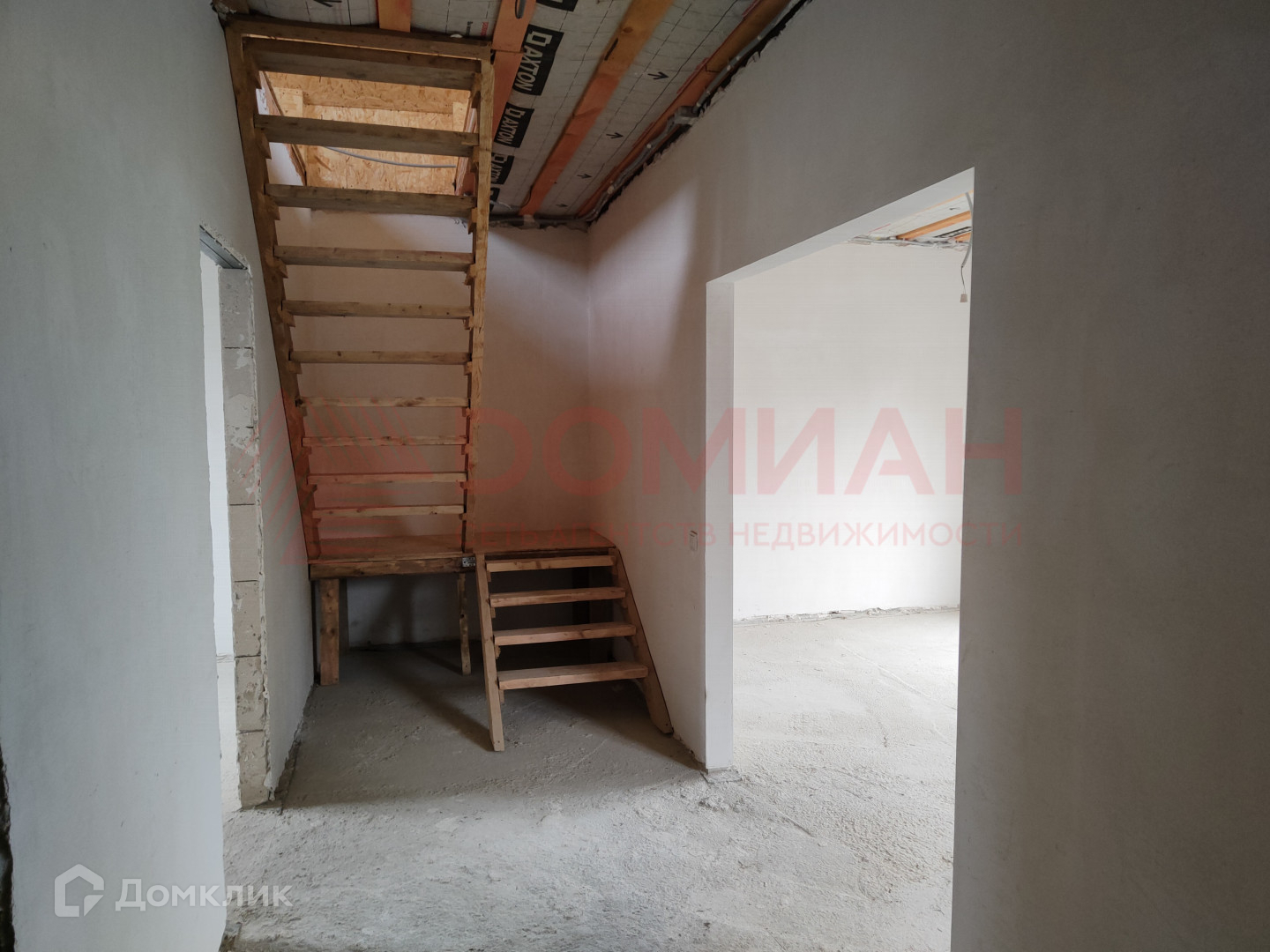 Первый этаж представляет собой просторную кухню-гостиную и одну спальню, а на втором этаже расположены две дополнительные спальни (перегородки пока не стоят, можно сделать одну большую комнату).