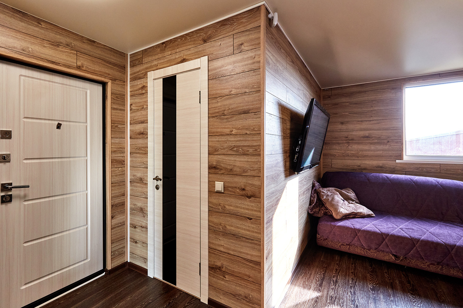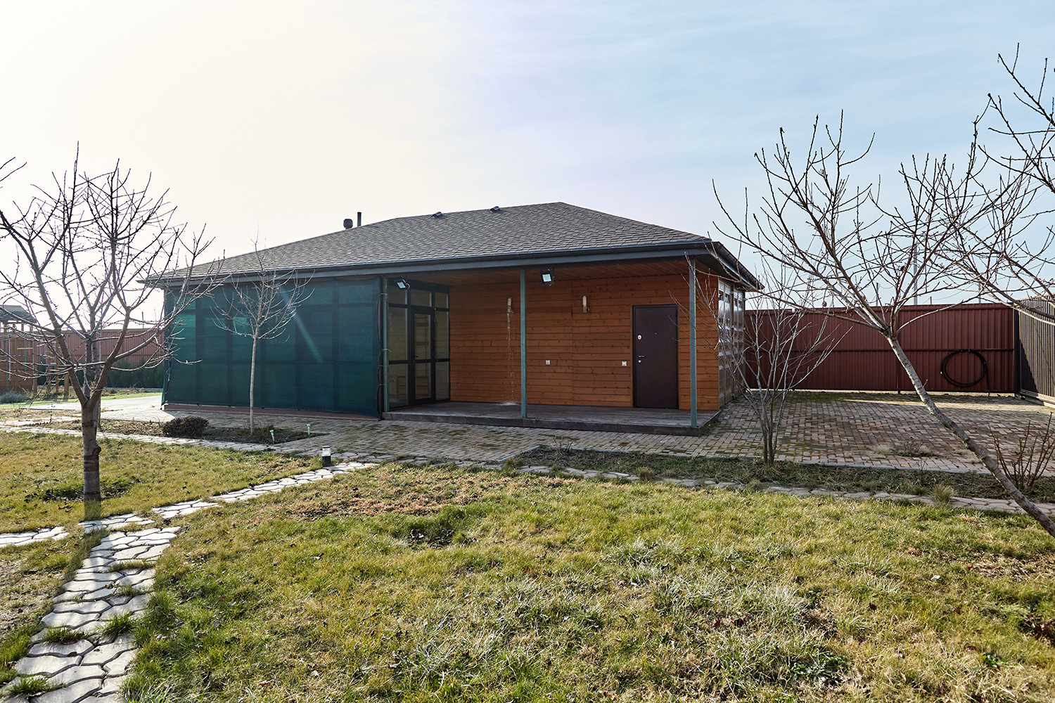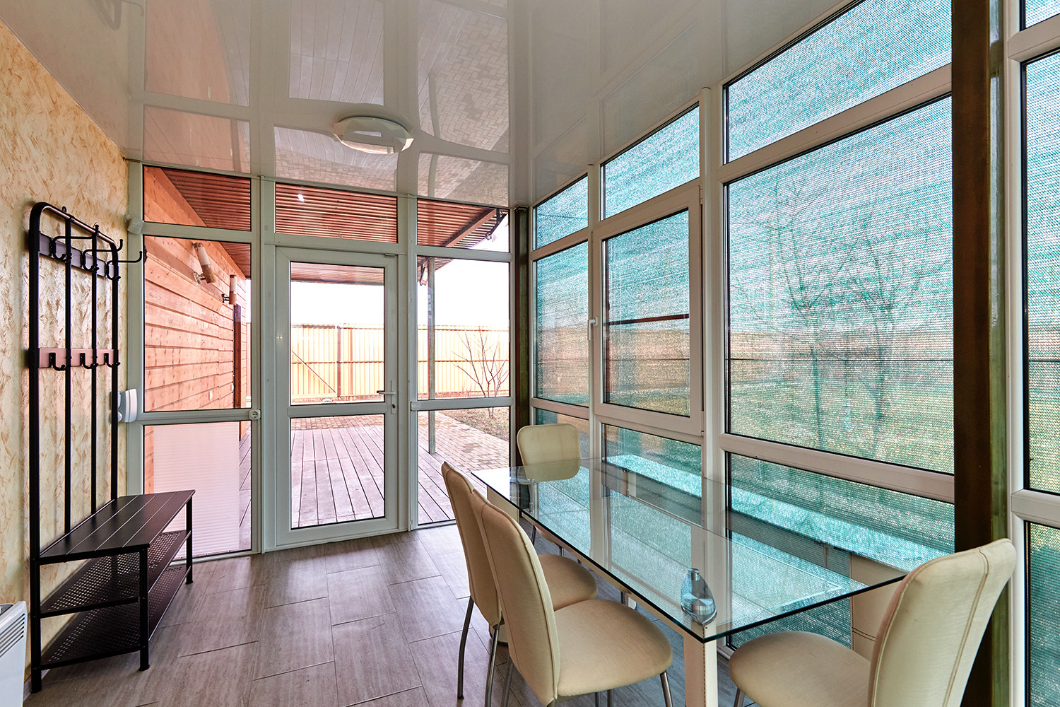 Дом с террасой, состоит из комнаты, санузла, остекленной веранды с кухонным гарнитуром. В комнате: диван, двухуровневые детские кровати, телевизор. Все новое, никто не жил.