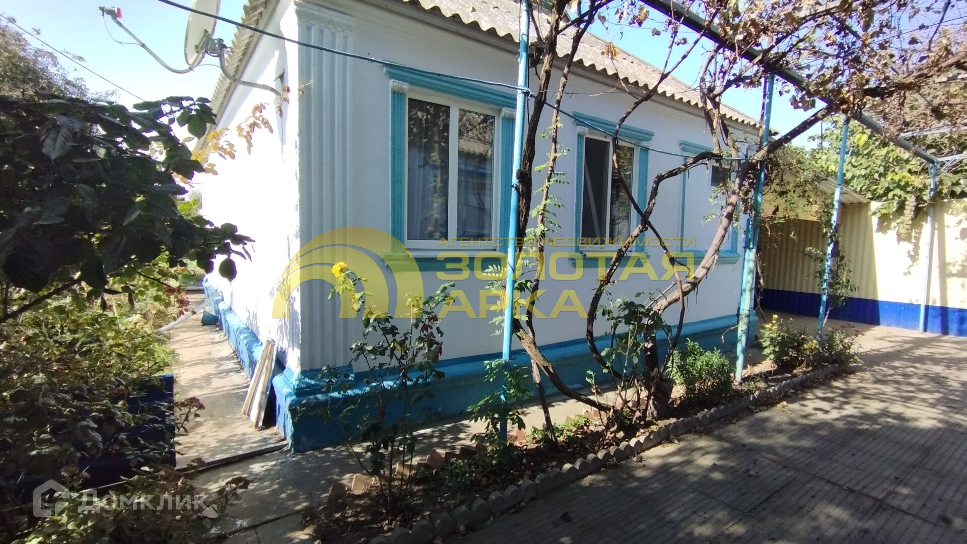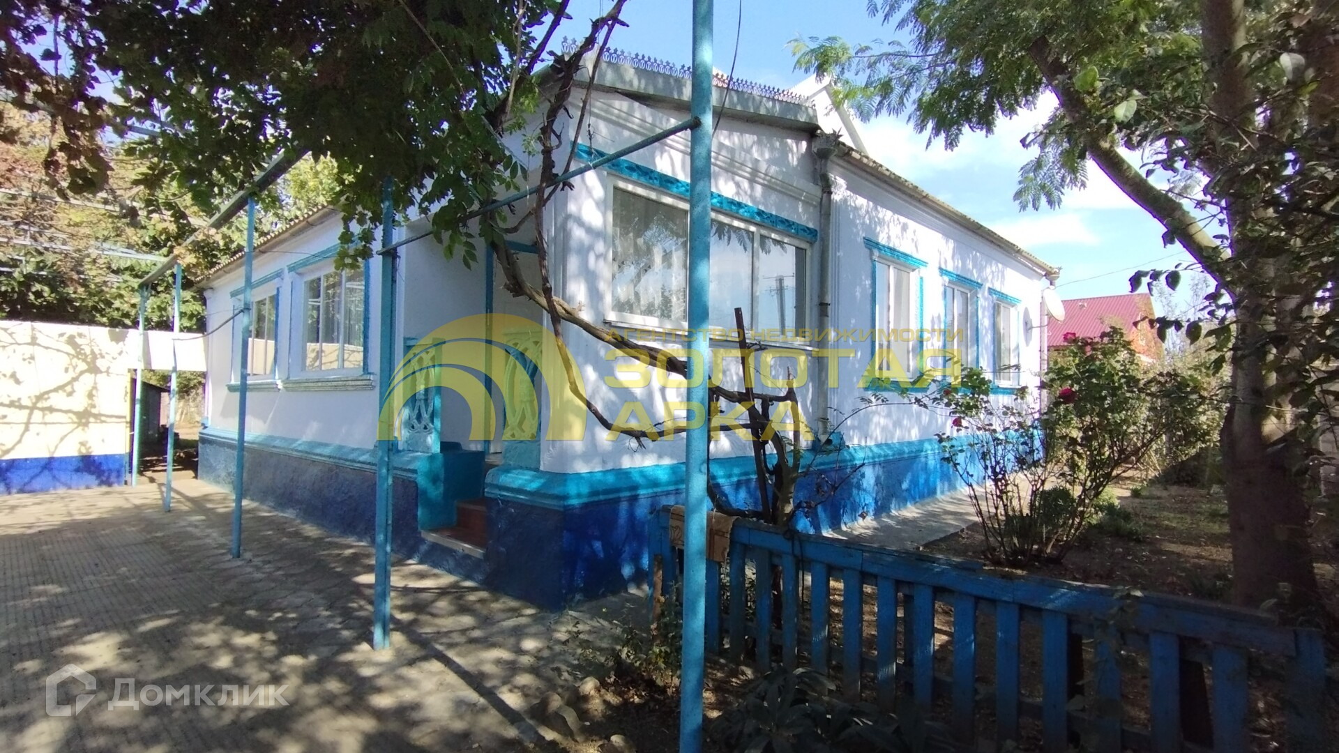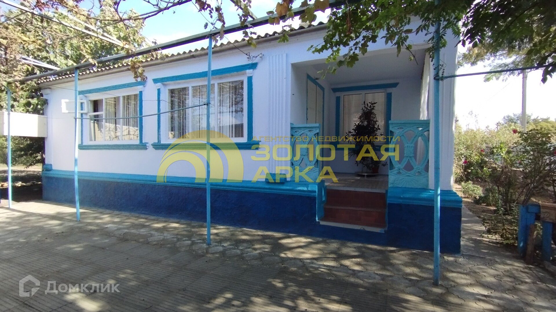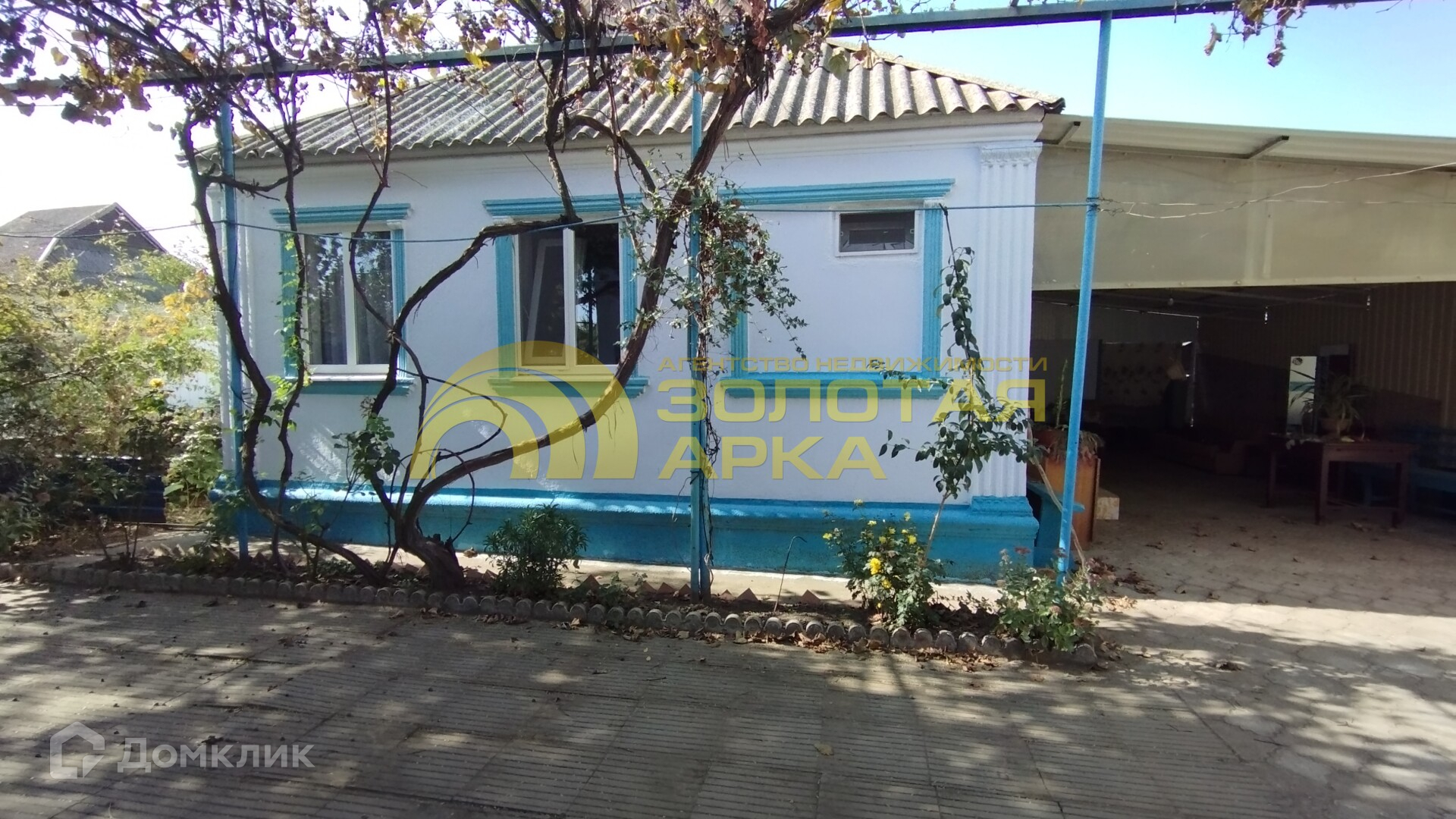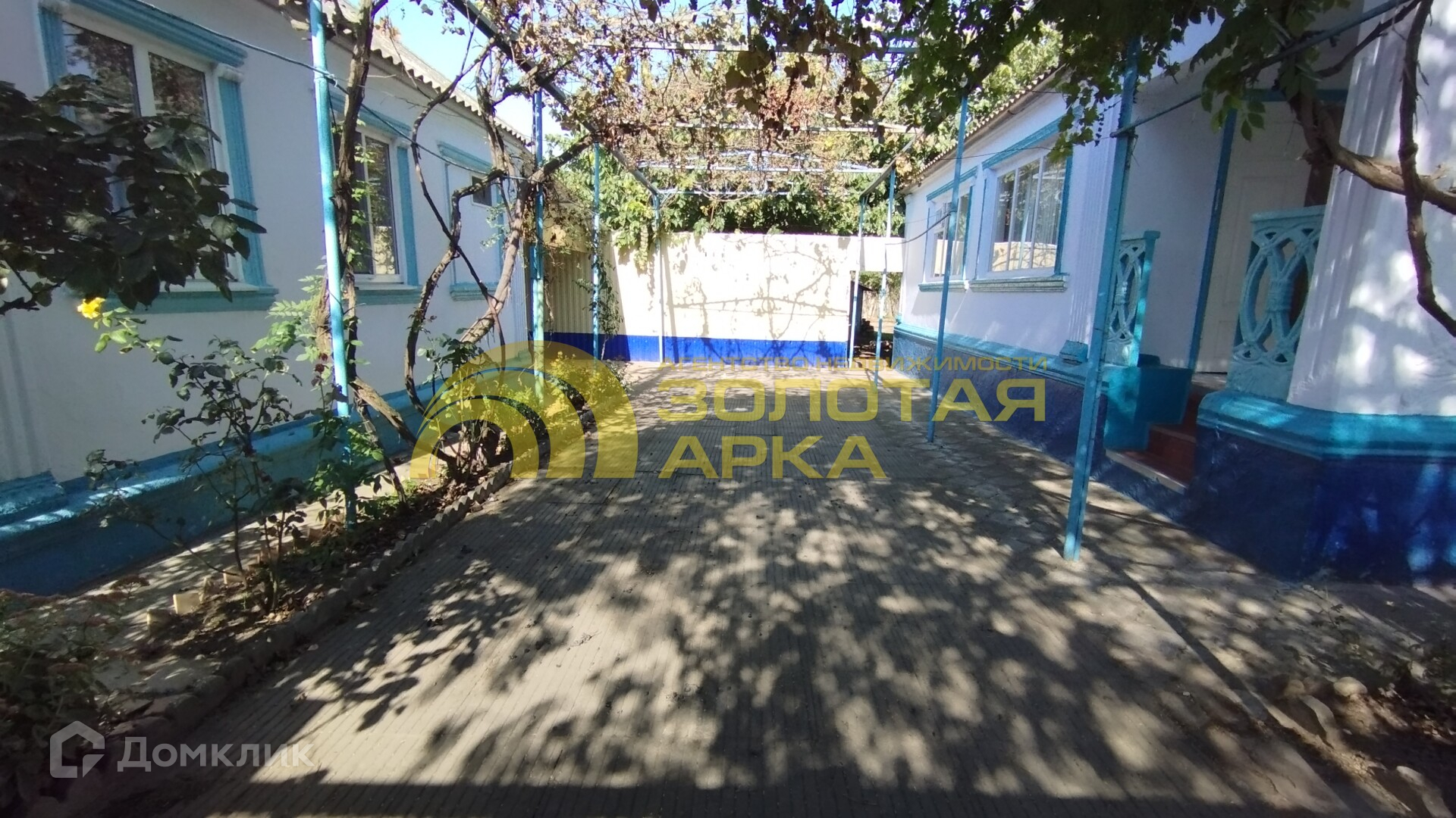 Двор выложен плиткой, есть виноградная беседка.
