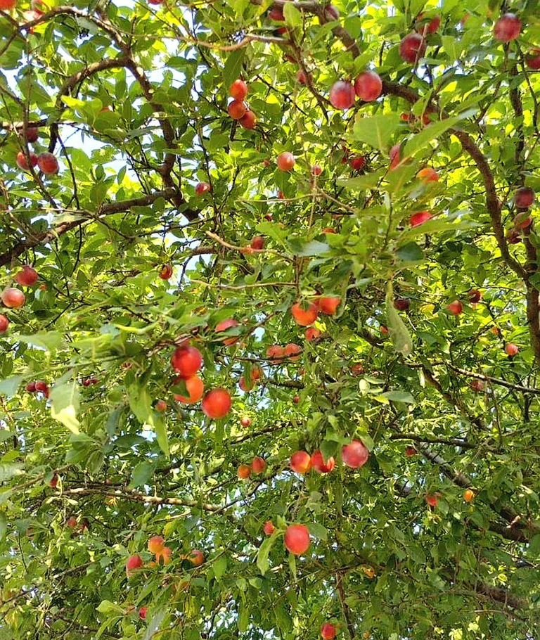 В саду растут несколько яблонь, гранаты, миндаль сливы, чернослив, вишня, черешня, миндаль, персик и тд . Все плодоносит.  От центра несколько минут, участок на возвышенности и никогда не топит. Это очень важный момент.