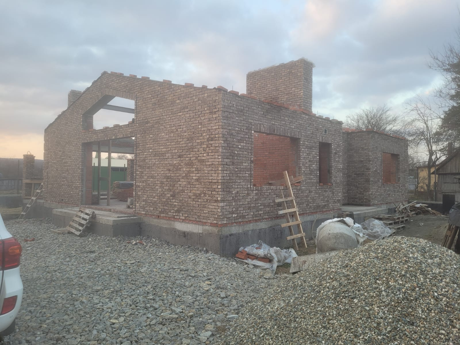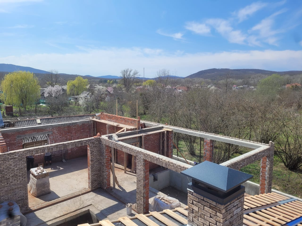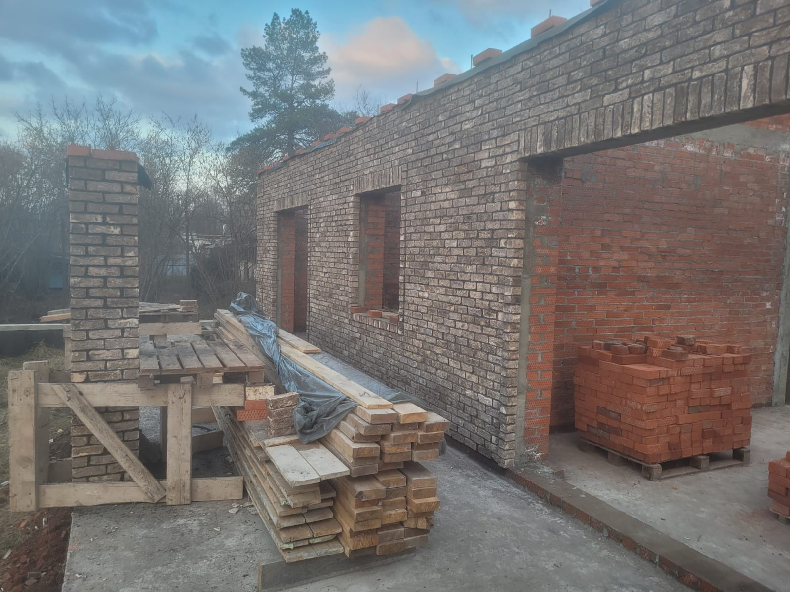 Начало строительства: 2022 год. Есть план строительства: три комнаты, гостиная, кухня, два сан узла. Осталось остеклить и сделать внутреннюю отделку.