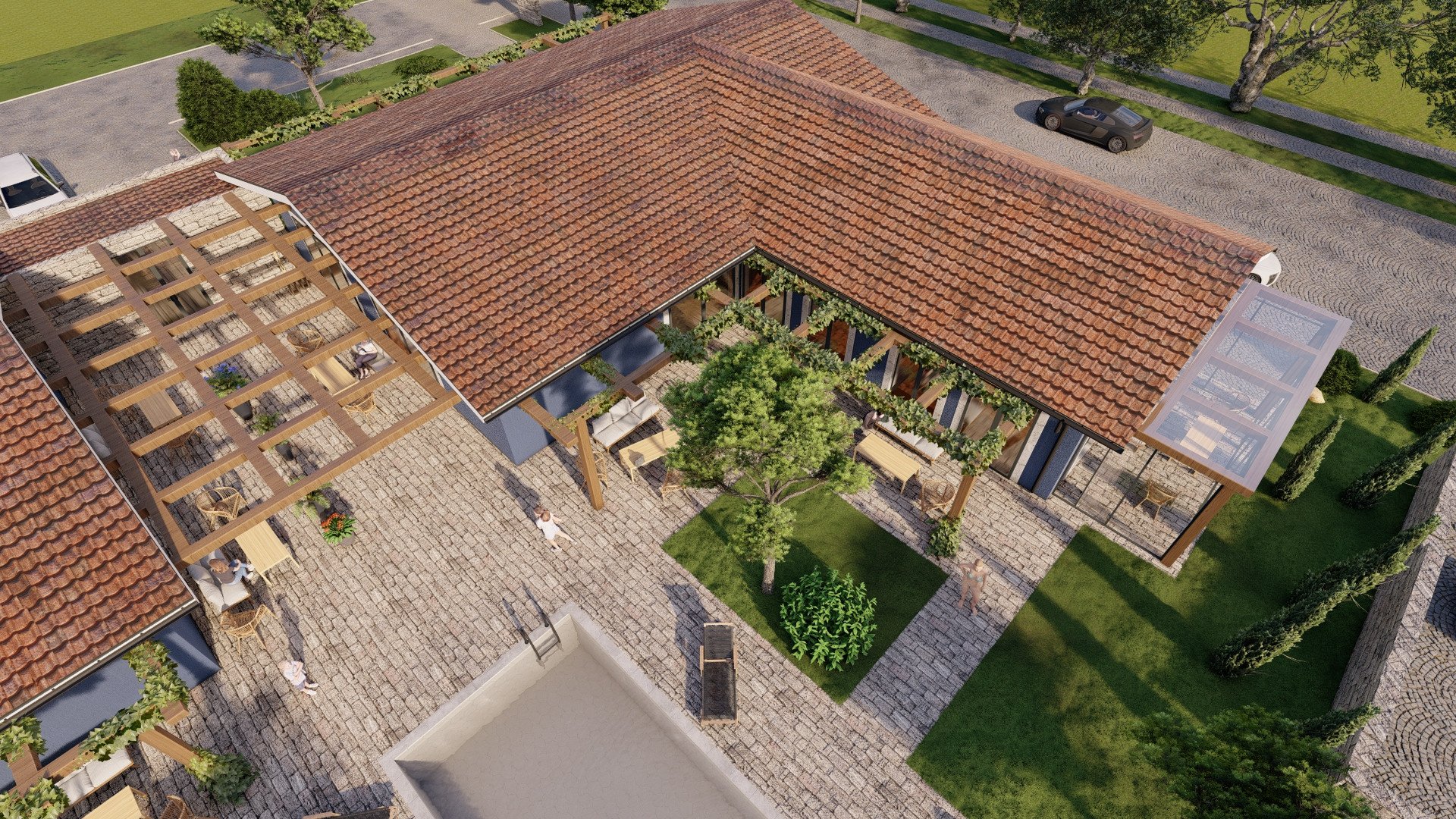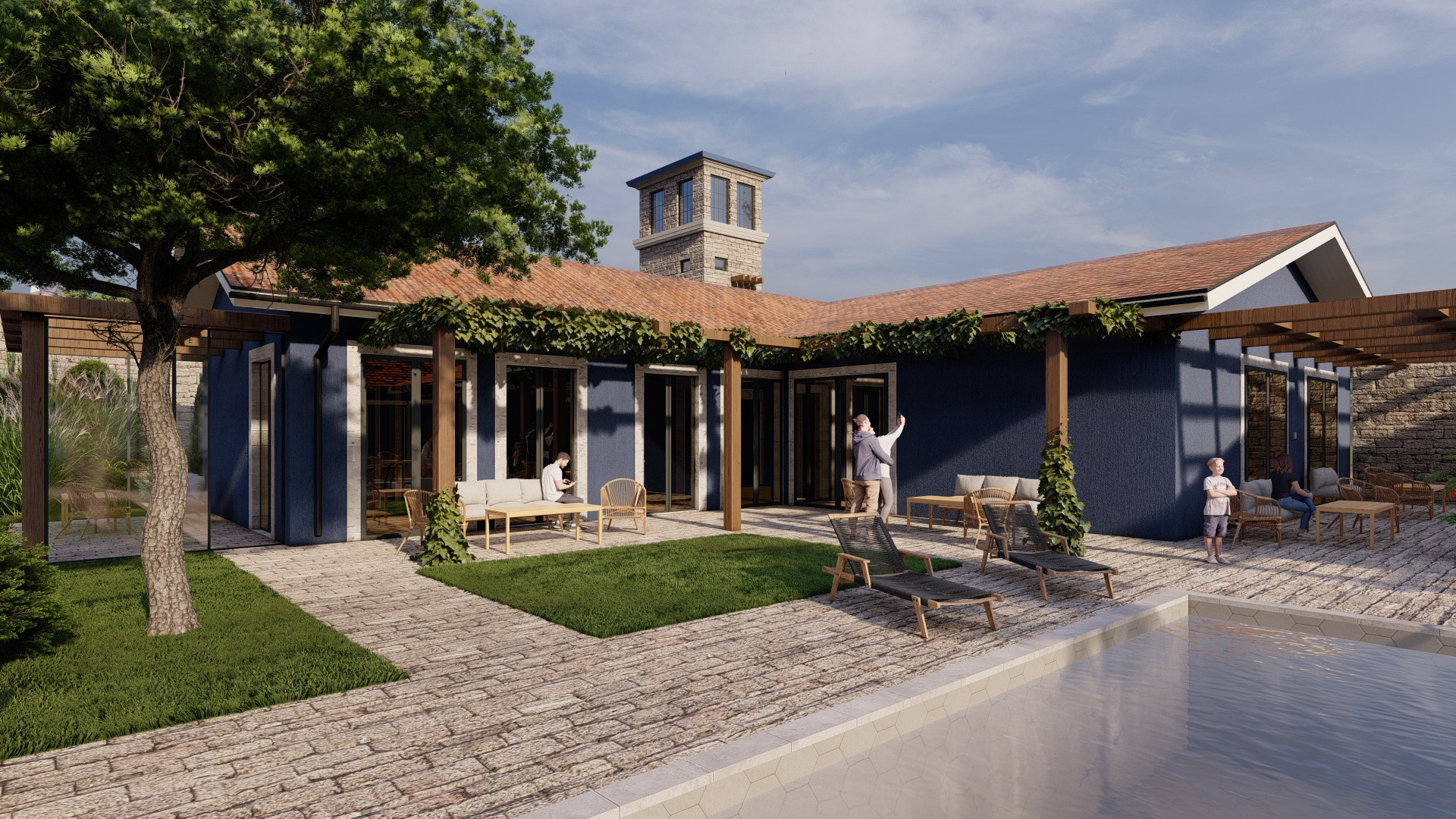 с общим бассейном, зоной отдыха, беседками.