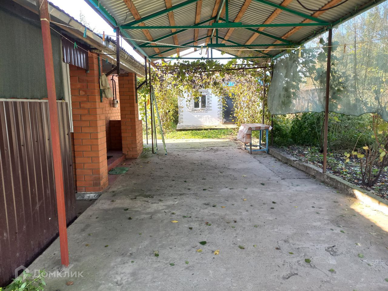 Двор бетонирован. Ворота распашные. Над двором большой навес из шифера на металлокаркасе. Рядом с двором виноградная беседка.