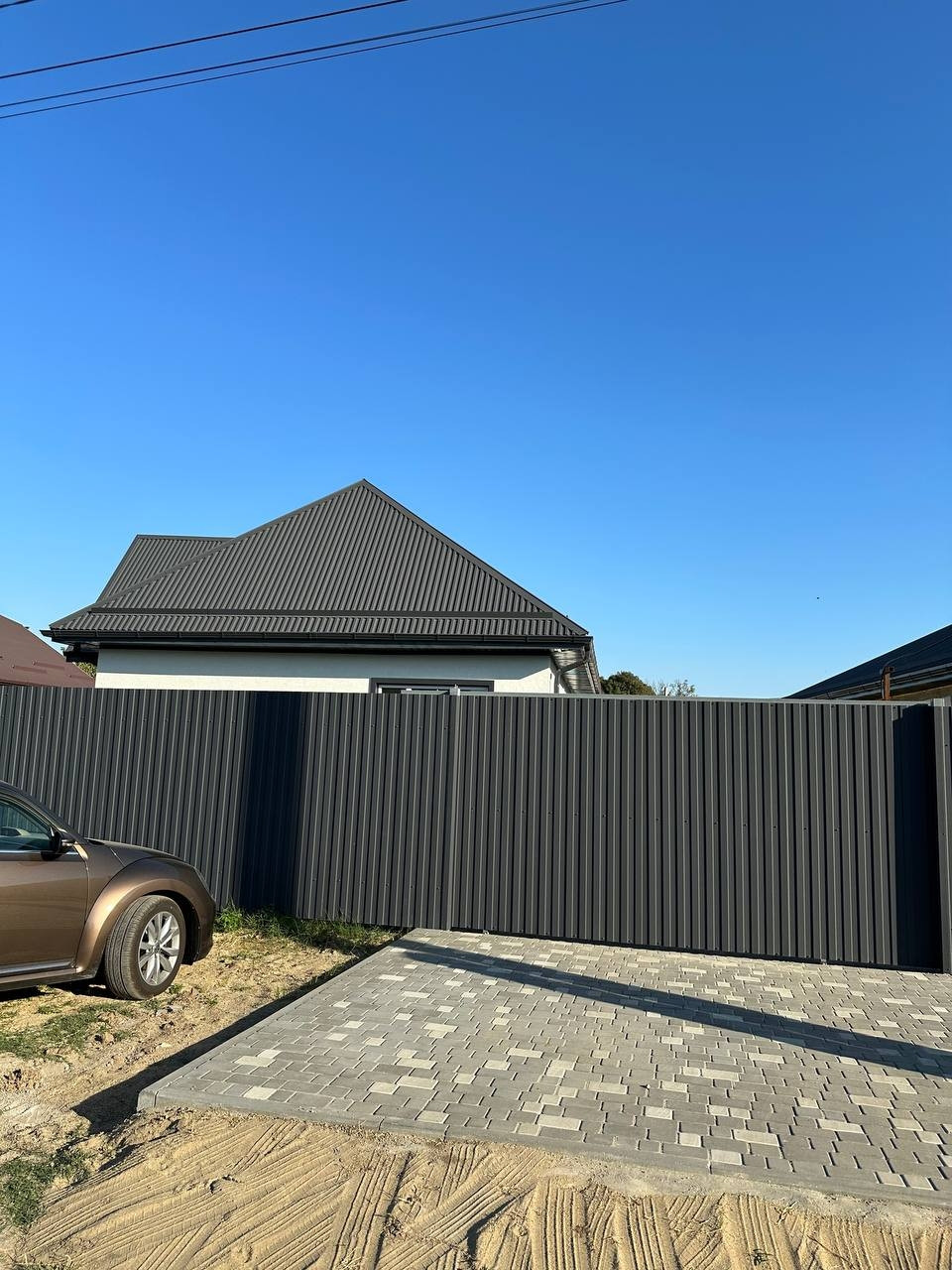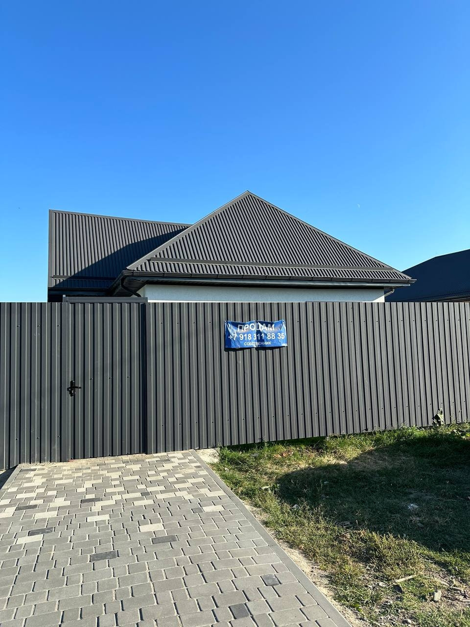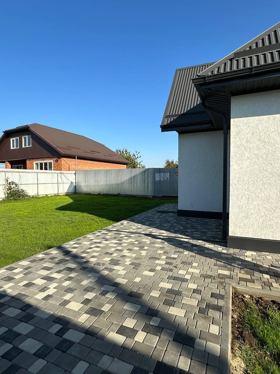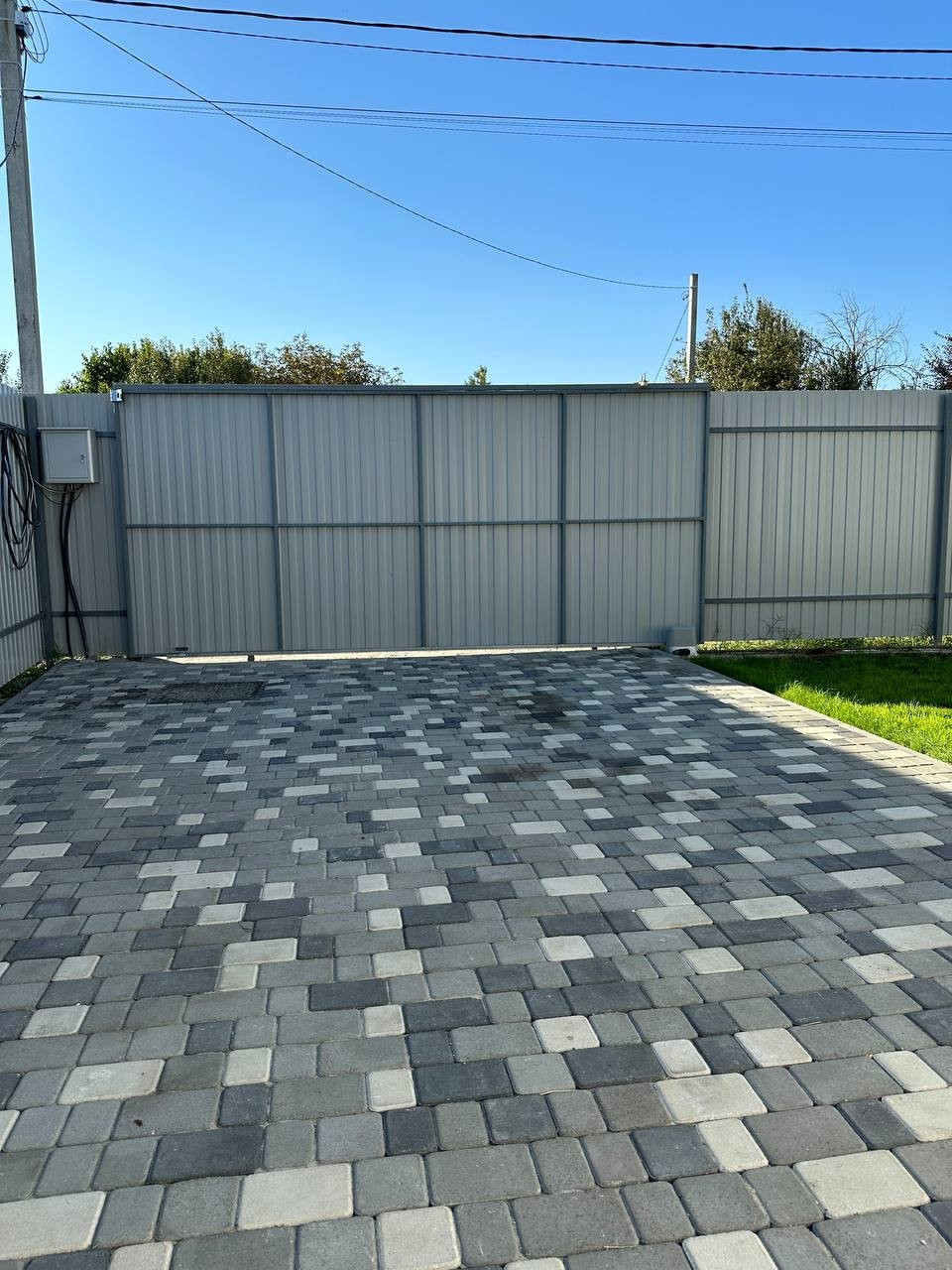 Ворота автоматические. Территория полностью благоустроена тротуарной плиткой и газонной травой.