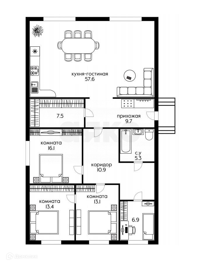 Площадь кухни 57.6 м2