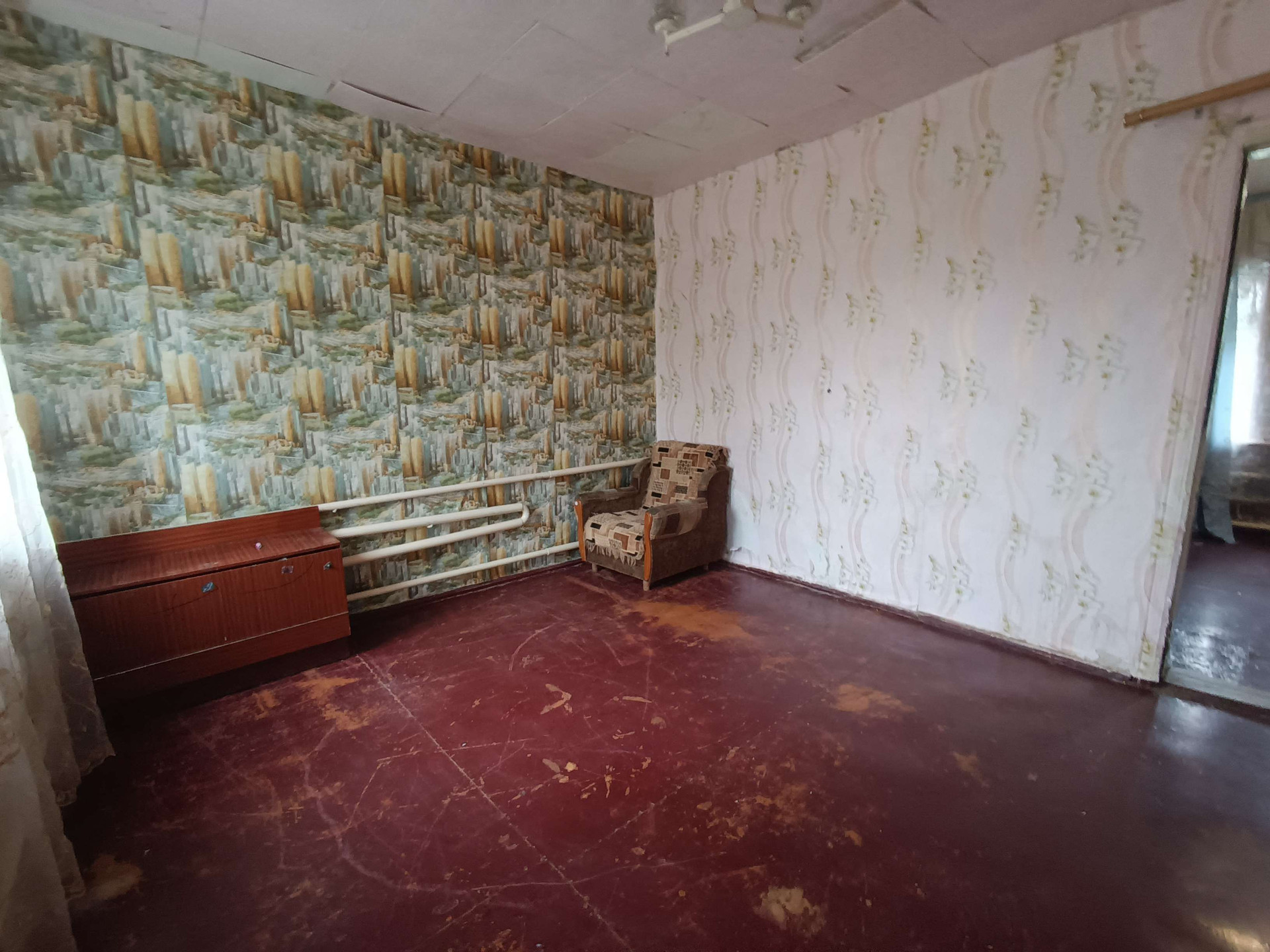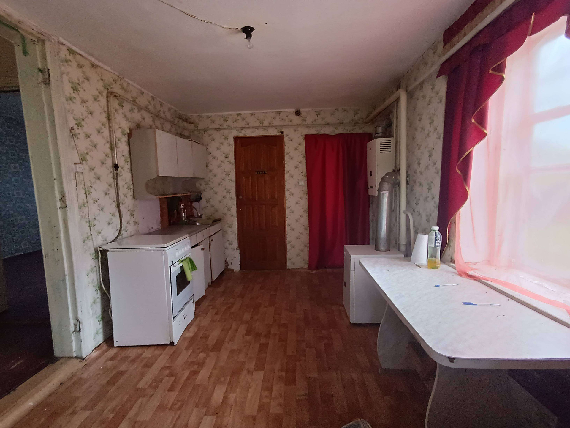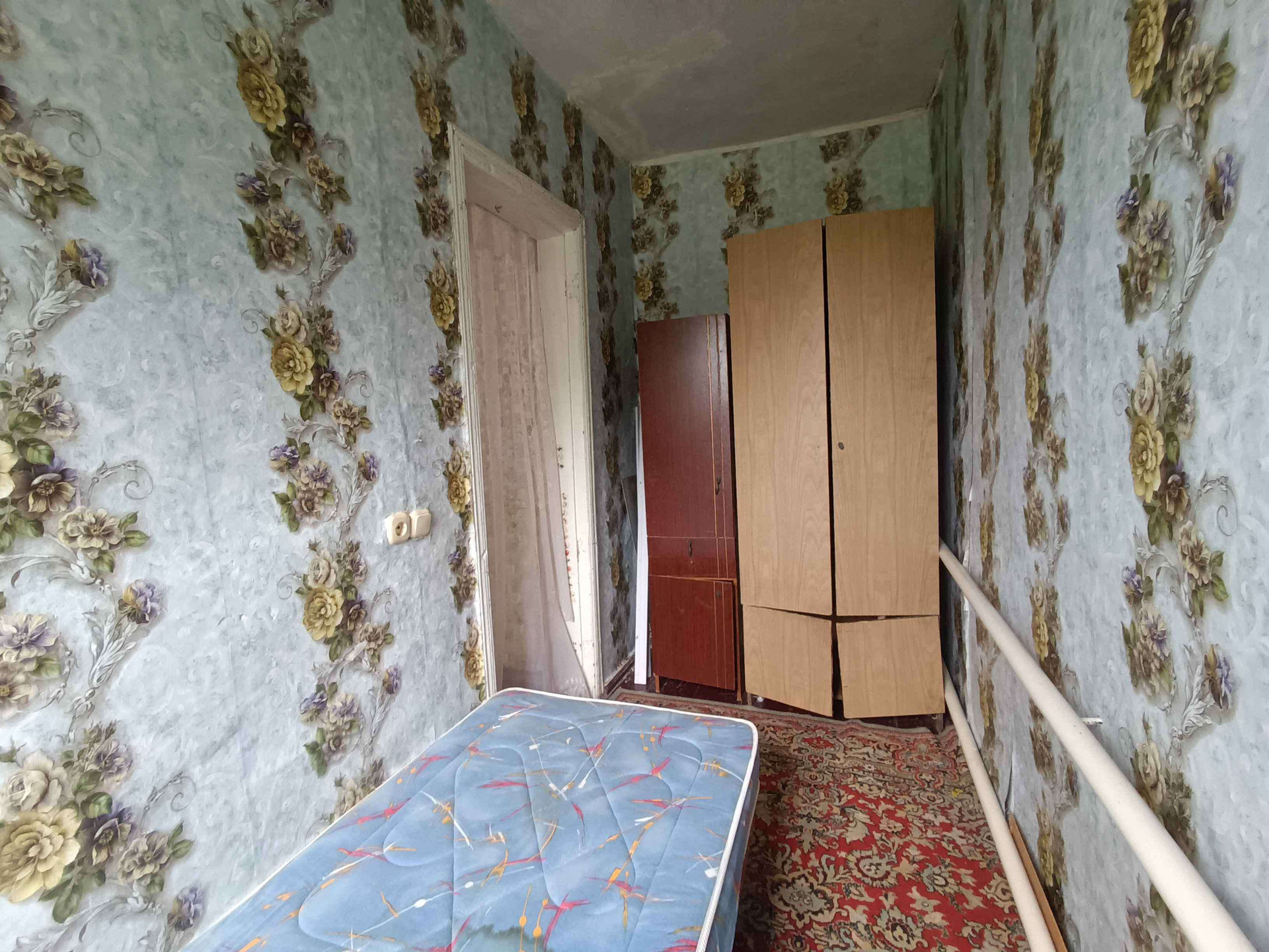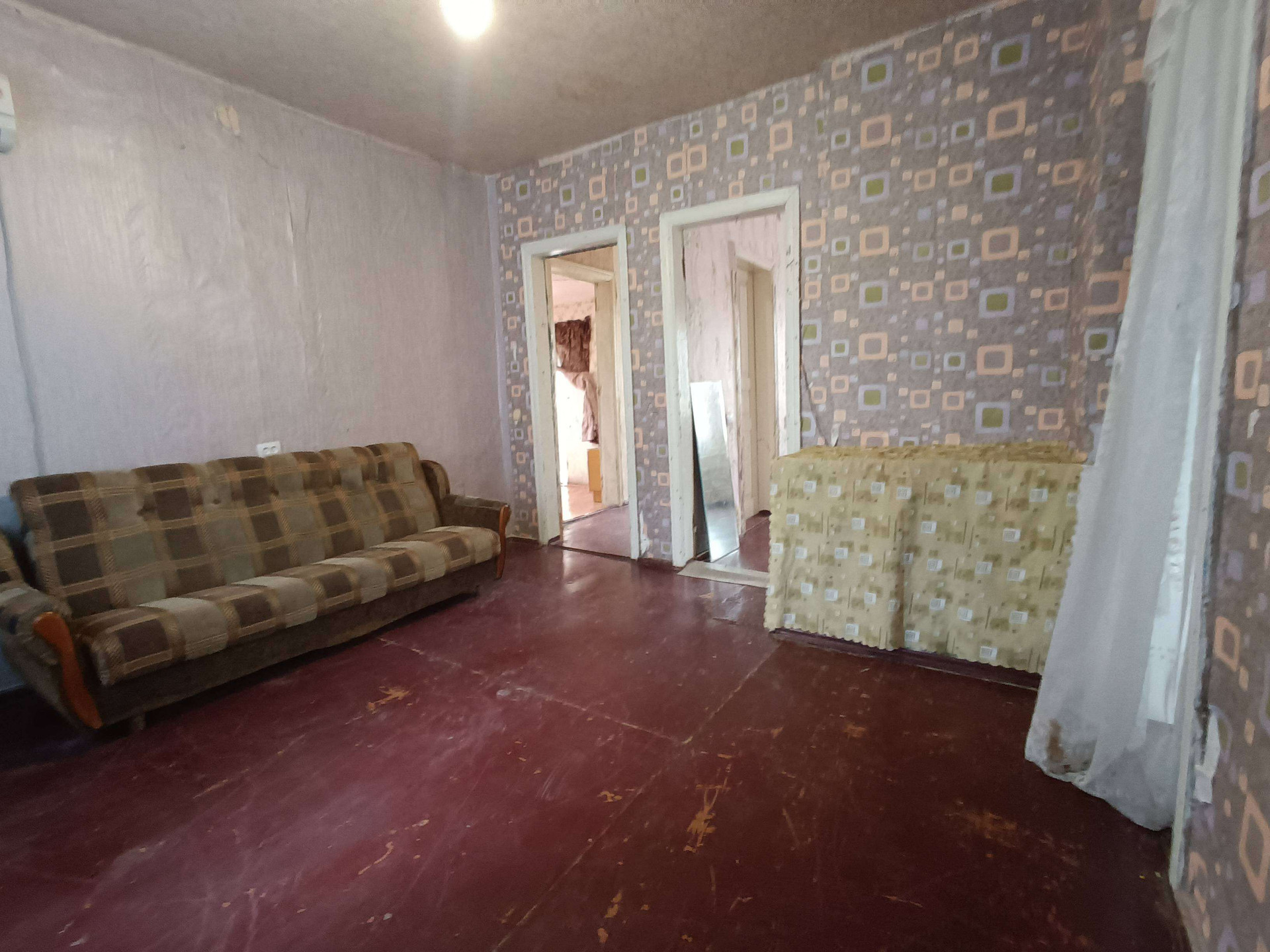 жения,кухни, с/у и коридоров. На стенах обои нейтральных цветов, потолки побелены, полы застелены листами ДВП. На кухне стены оклеены обоями, потолок побелен, полы застелены линолеумом. С/у раздельный, обшит пластиковыми