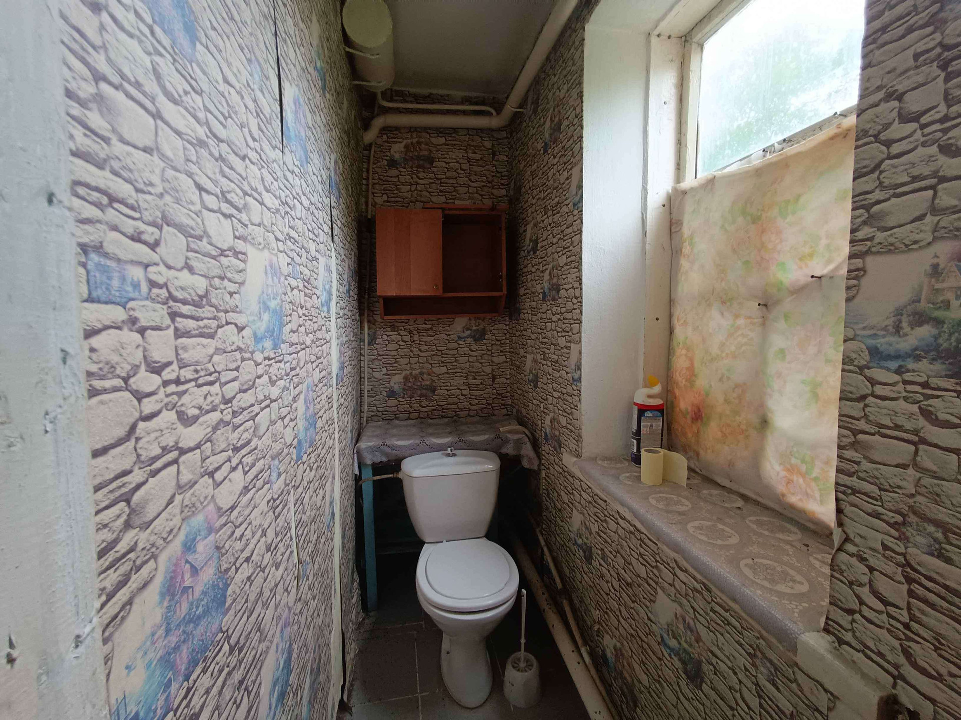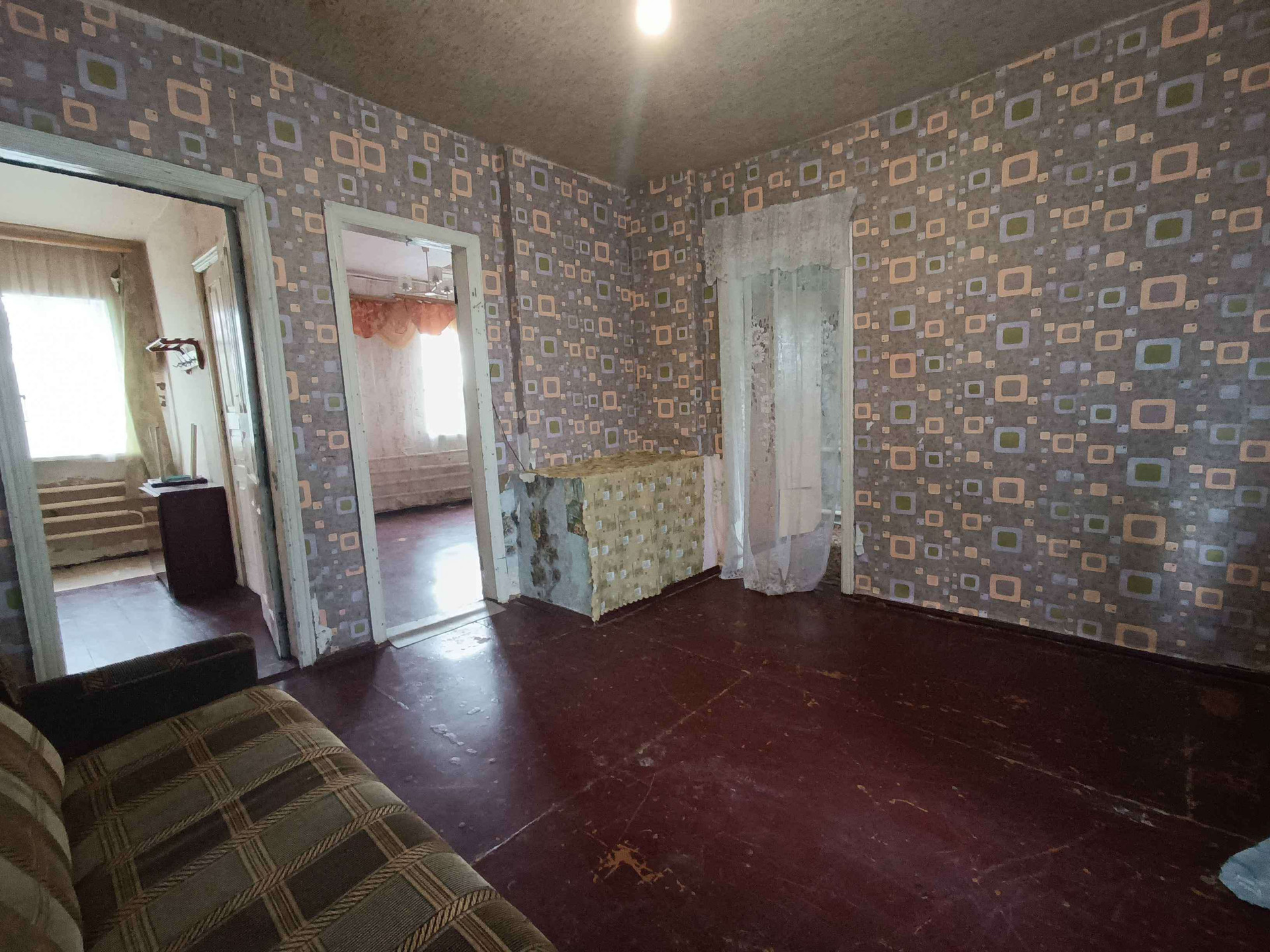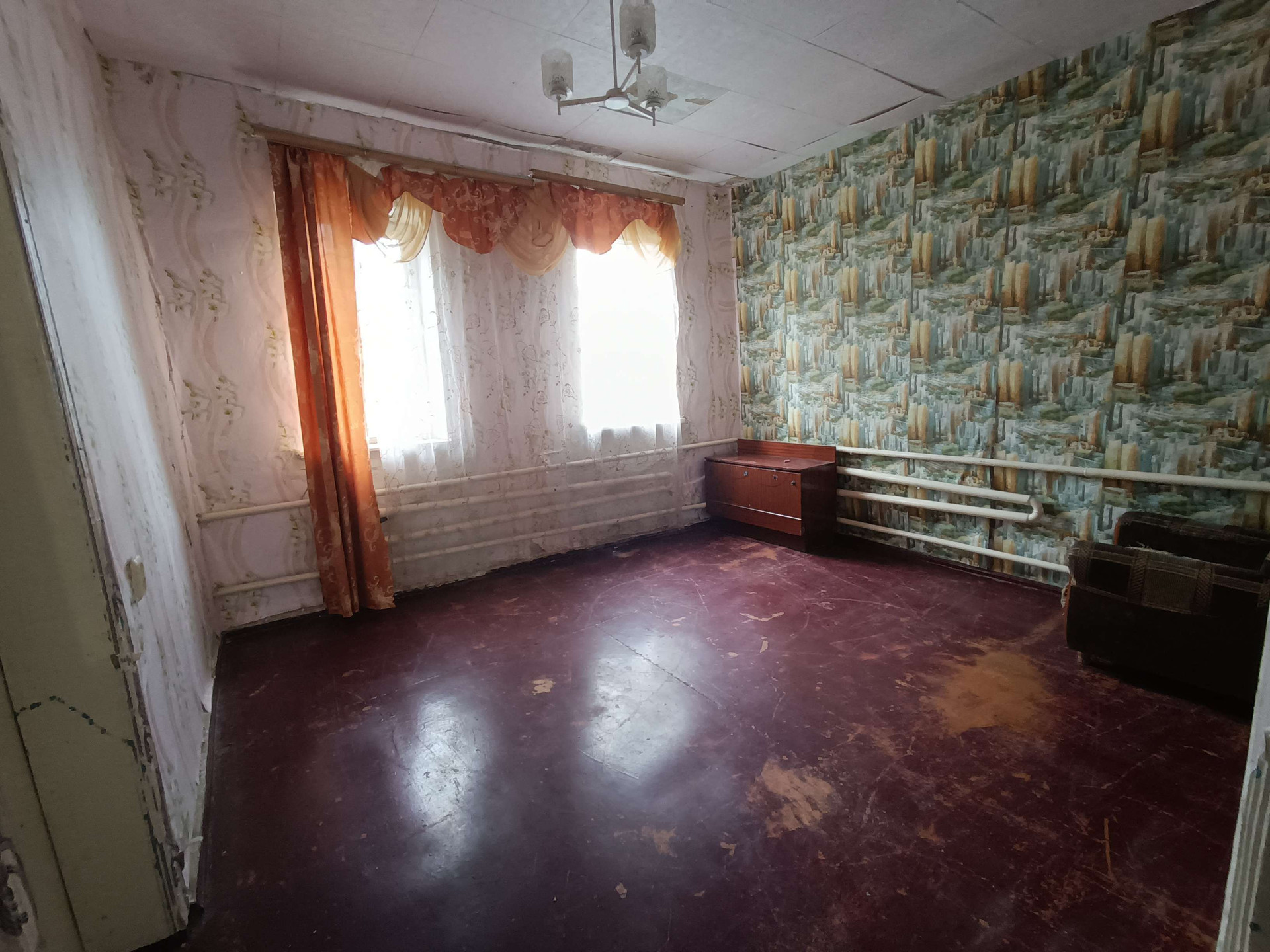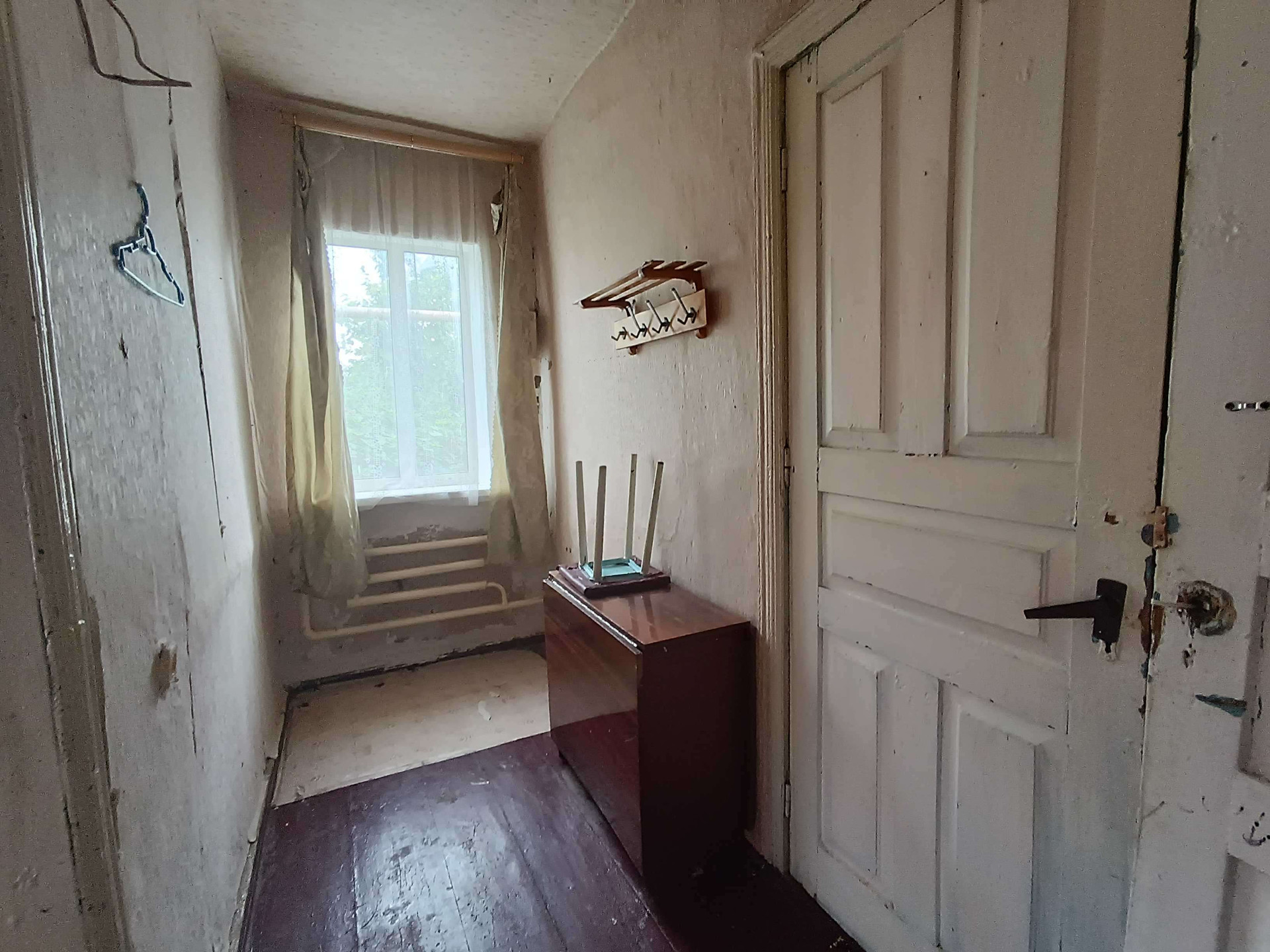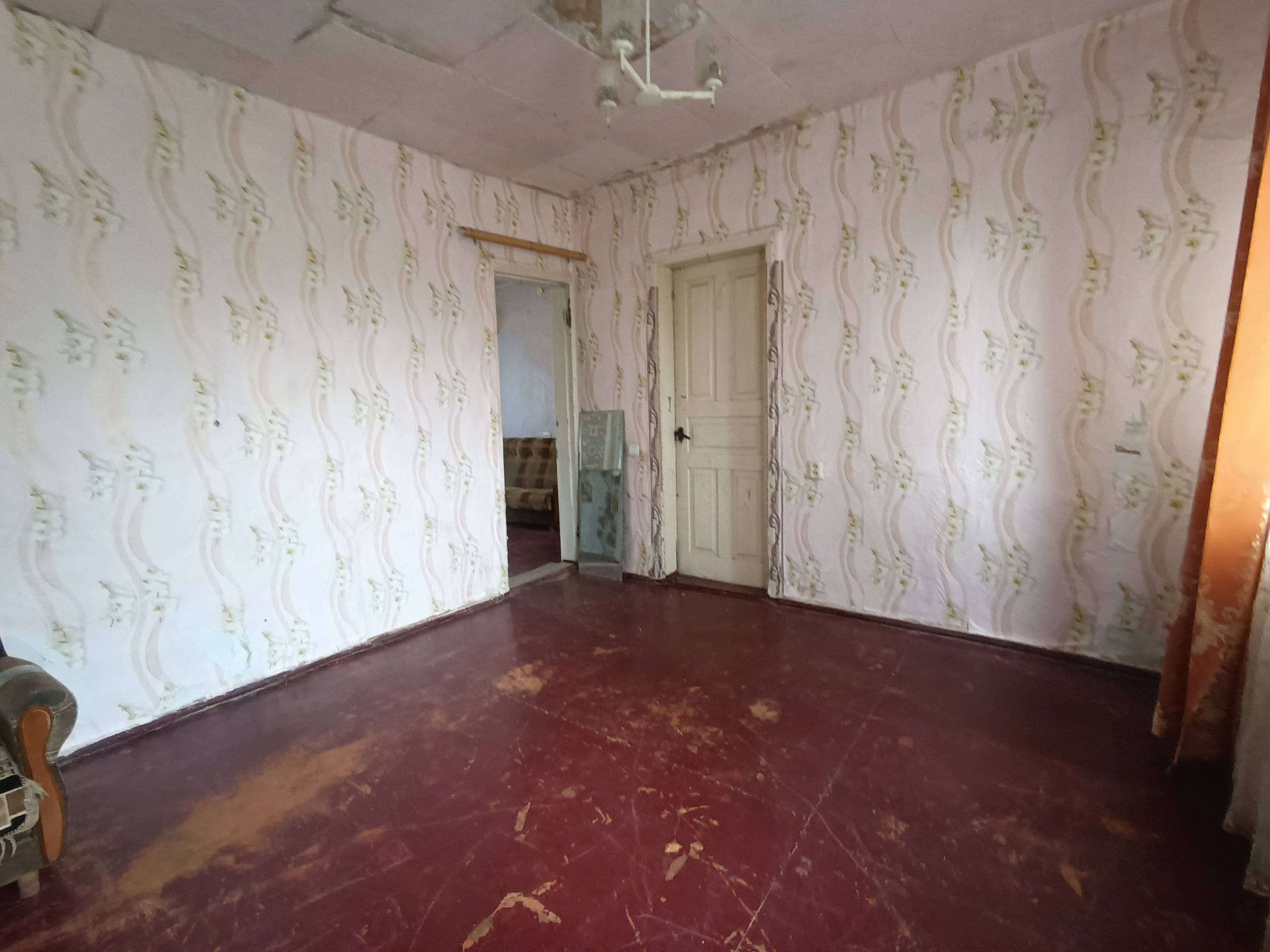 жения,кухни, с/у и коридоров. На стенах обои нейтральных цветов, потолки побелены, полы застелены листами ДВП. На кухне стены оклеены обоями, потолок побелен, полы застелены линолеумом. С/у раздельный, обшит пластиковыми