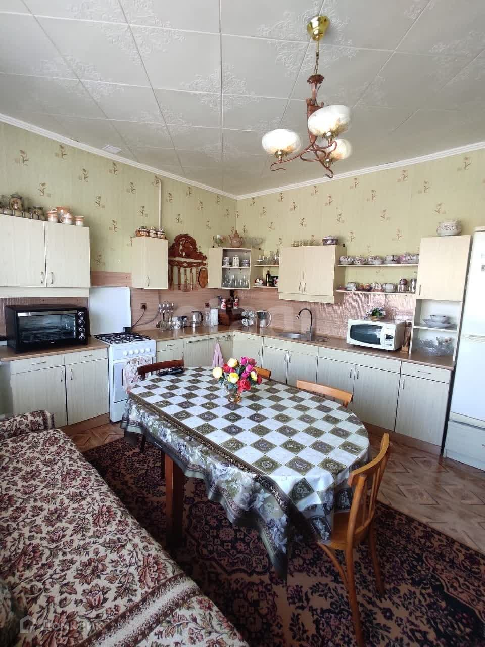 Общая площадь дома - 119 кв.м, жилая - 57 кв.м. В доме 3 изолированные комнаты, большая кухня - 20 кв.м., совмещенный санузел, два коридора и веранда. Материал стен: кастроблок, обложен кирпичом, крыша шифер. Потолки высокие 3 метра. Хороший косметический ремонт. При продаже в доме остается встроенная кухня.