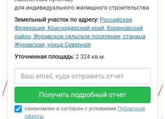 Продается участок в ст-це Журавской площадью 25,4 сотки, фасад 32 м, глубина 75 м. Газопровод проходит по улице, на участок заведено электричество 3 фазы, 15 кВт, асфальтированная дорога. На участке залита лента фундамента, имеется проект и видео возведения фундамента. До ближайшего магазина 7 минут пешком, до центральной части станицы (администрация... |