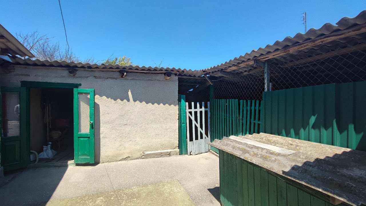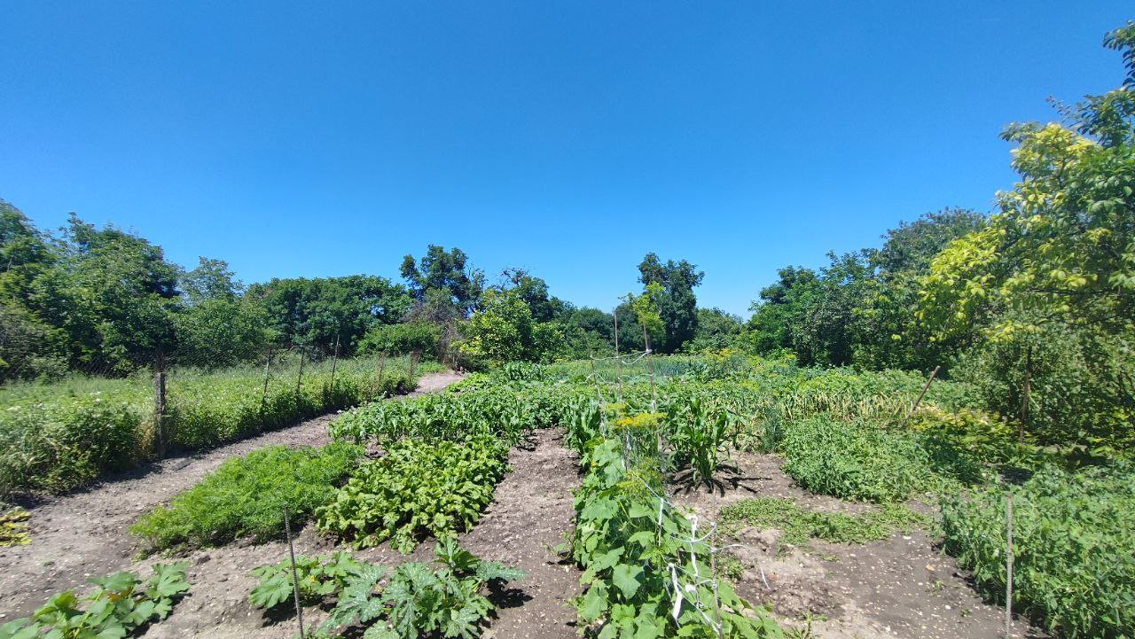 Двор заасфальтирован, имеется металлический каркас под виноград. установлен уличный водяной кран. Есть хозпостройки и подвал. Огород ухожен, имеются плодоносящие деревья и кустарники. В конце огорода протекает речка, можно использовать для полива.