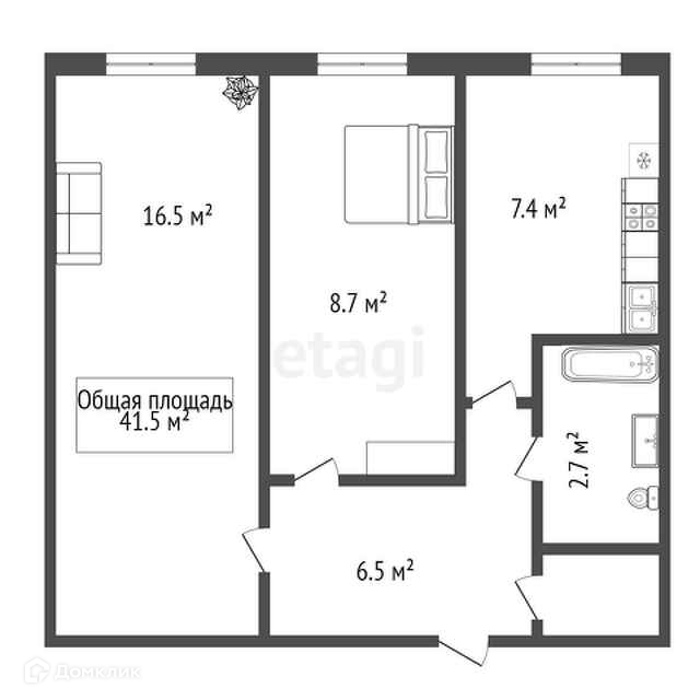 Общая площадь 41.5 м2