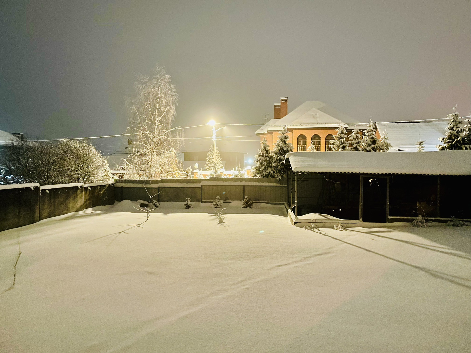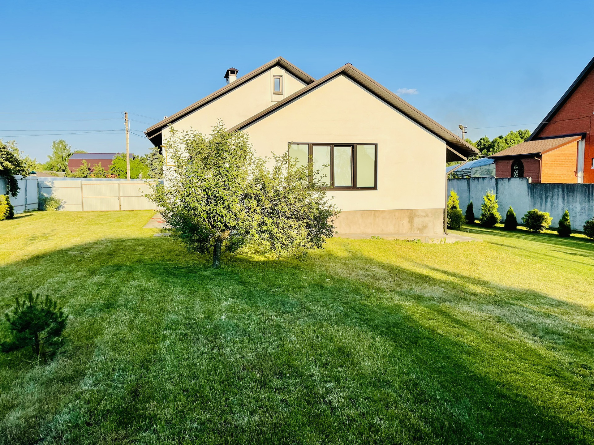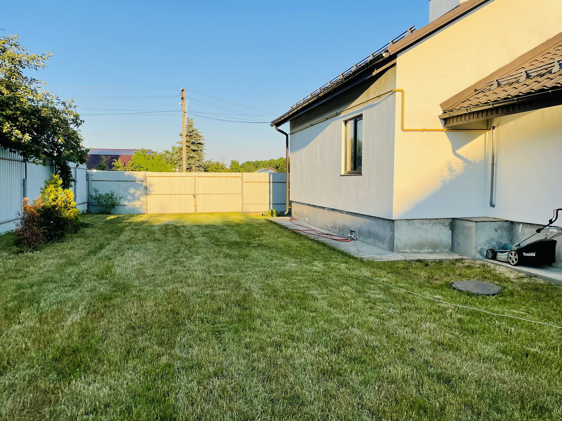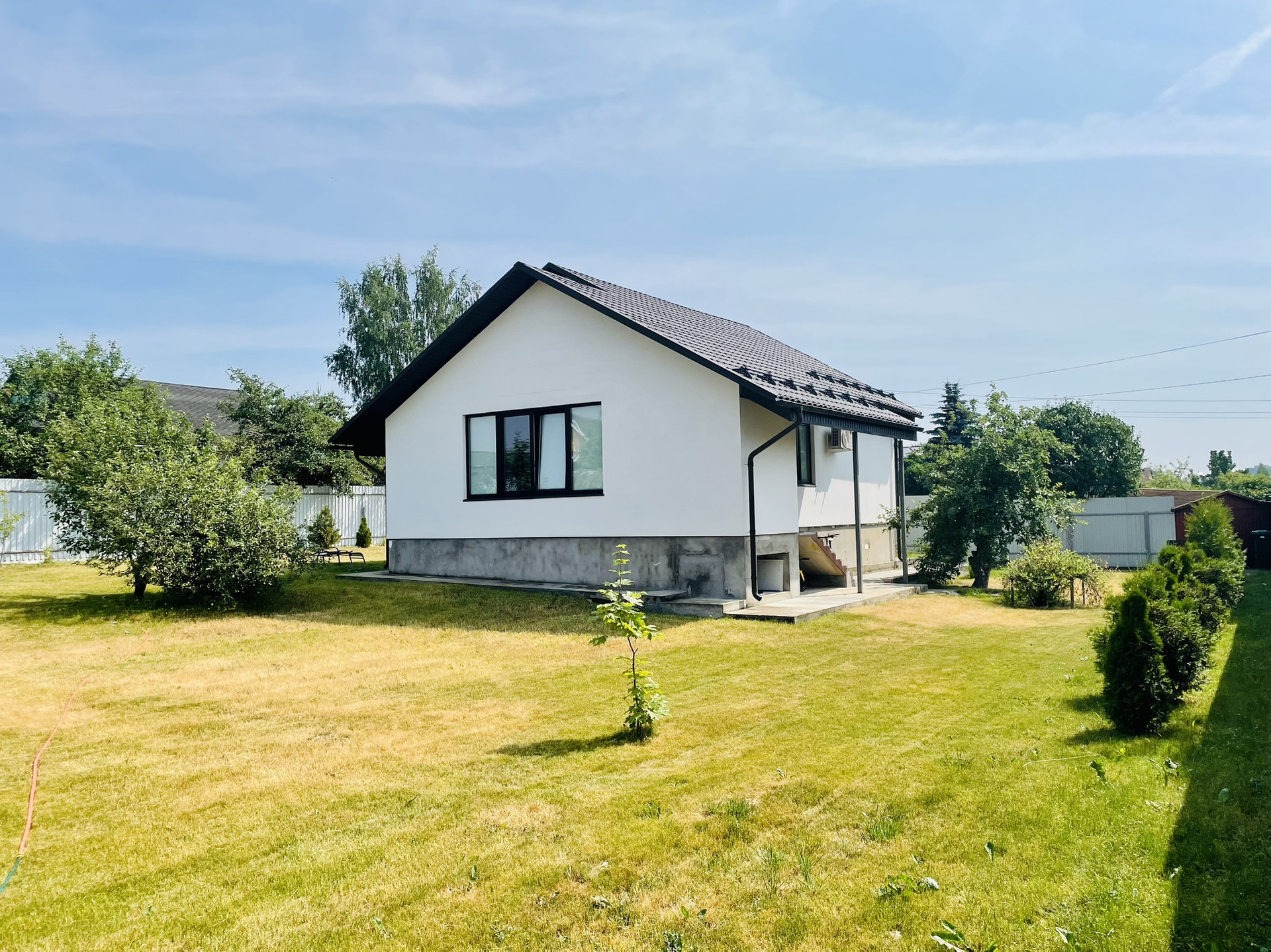 Участок ухожен: газон, посажены деревья. Под навесом старая хоз постройка на бетонном фундаменте.