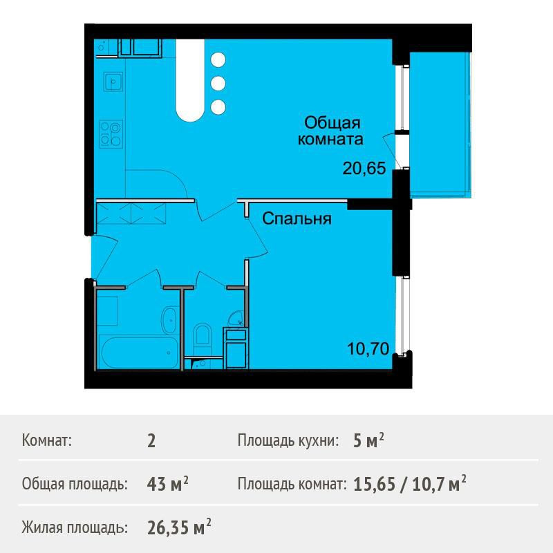 Общая площадь 43.1 м2