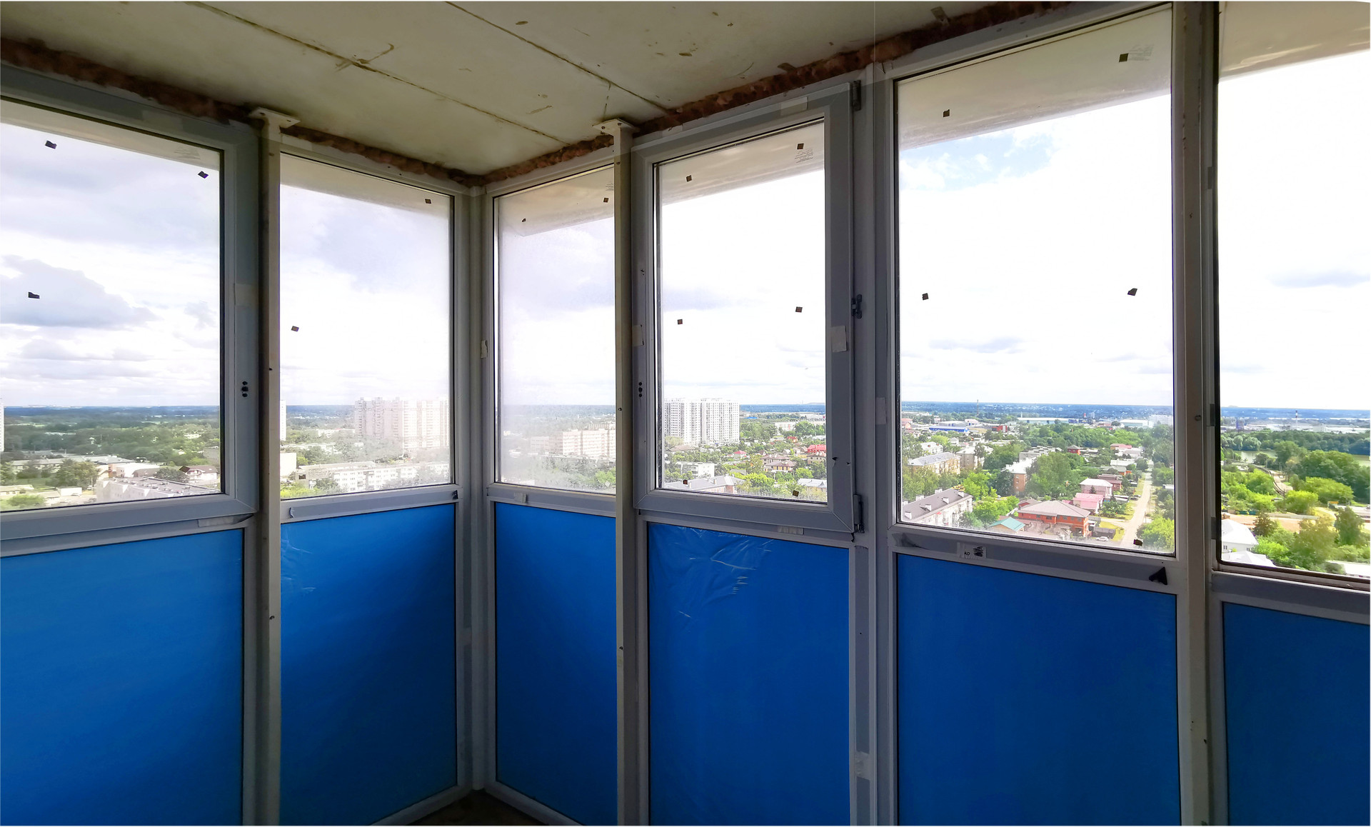 Светлая евродвушка с панорамным видом из окна на город и озеро.
