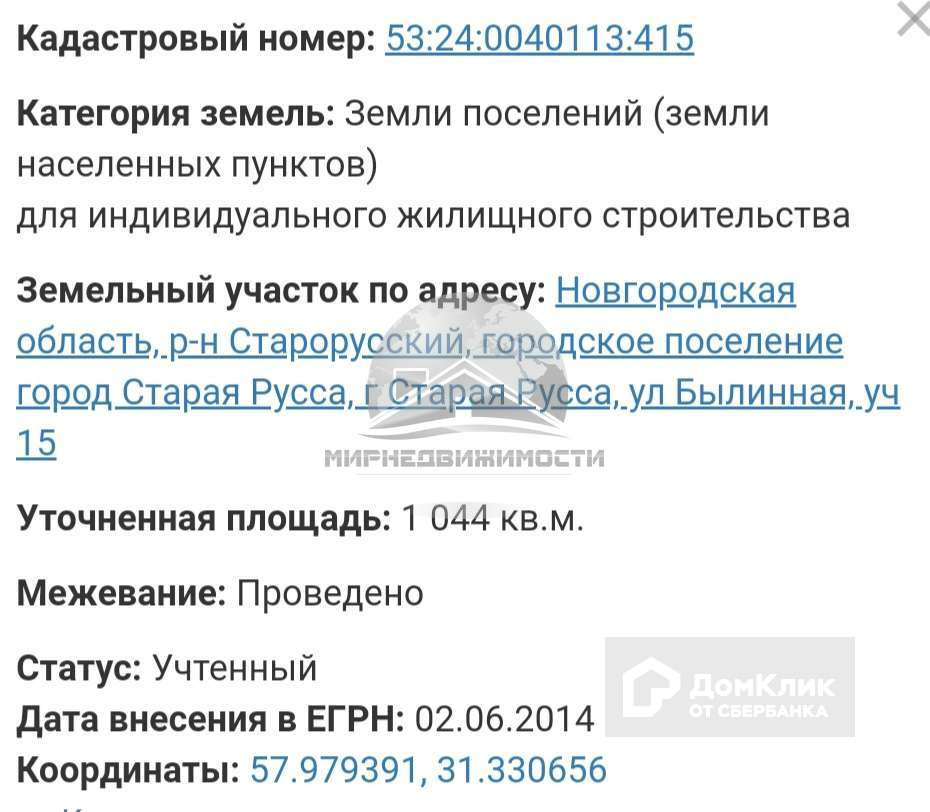 Продам земельный участок 1044 кв.м. в г.Старая Русса, ул. Былинная. ИЖС. Электричество подведено. Межевание проведено.