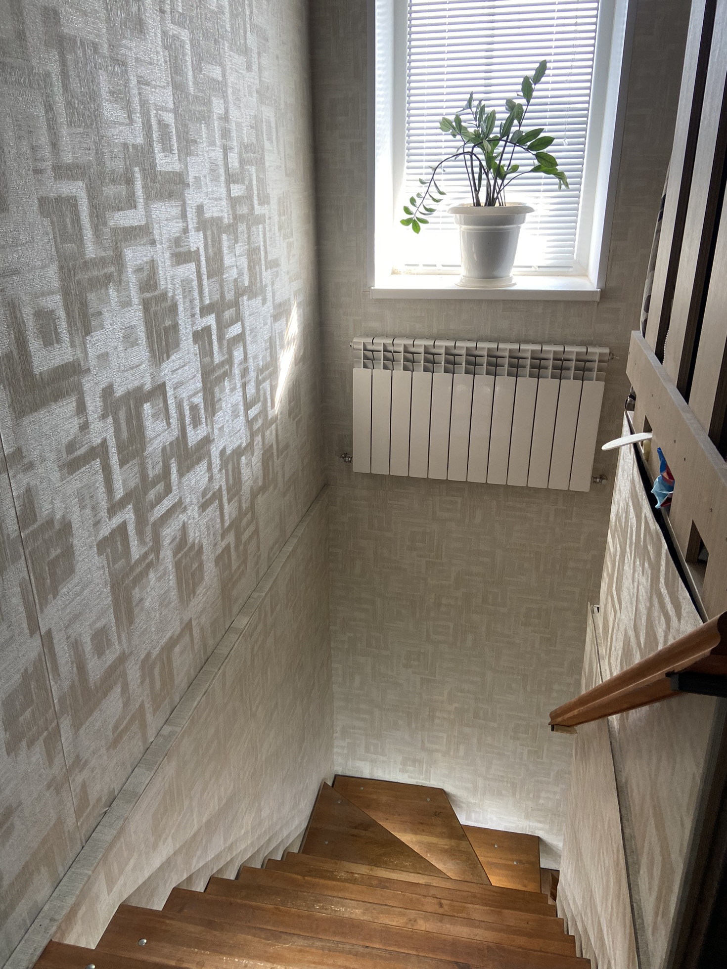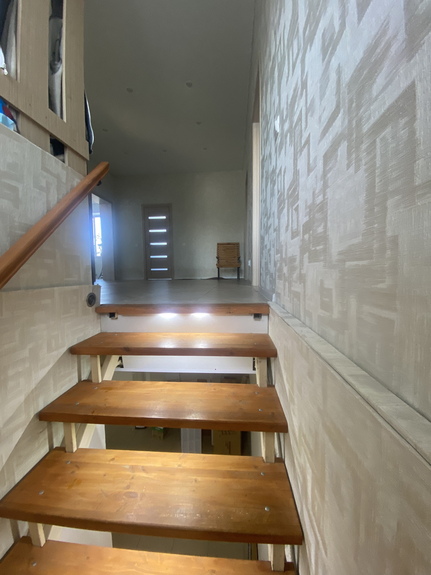 — Лестница ведущая в большое светлое помещение (используется для бизнеса, можно организовать пространство для гостиной или полностью перевести в зону хранения).