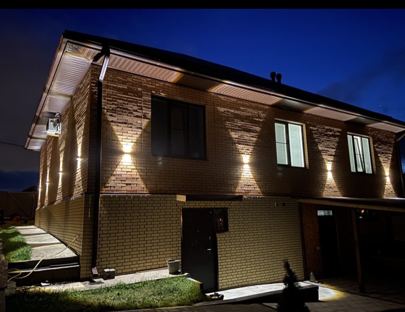 — Шикарная подсветка дома в ночное время;