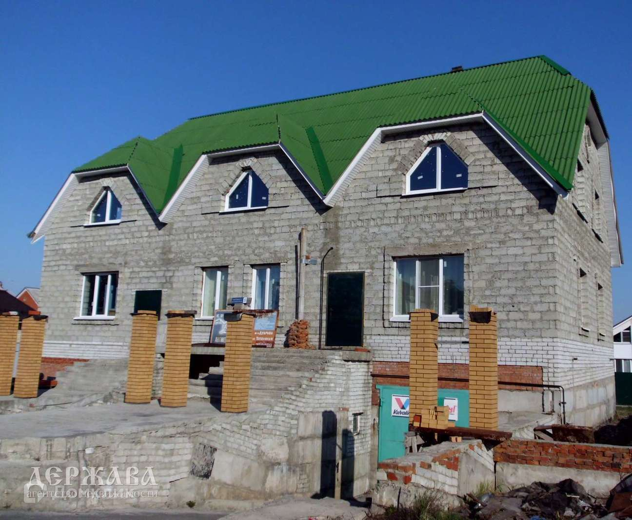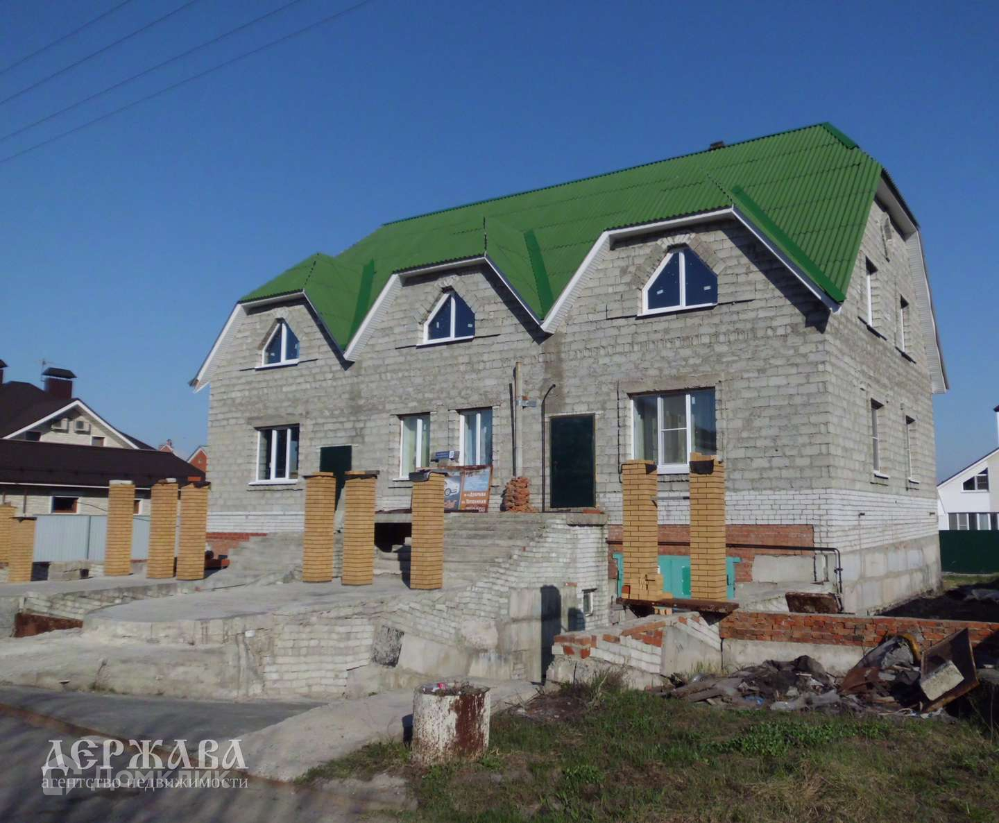 Построен в 2011 году, стены керамзито-бетонный блок ( в полблока ) с утеплением 150 мм пеной и еще полблока из керамзито-бетона, кровля шифер, фасад под отделку.