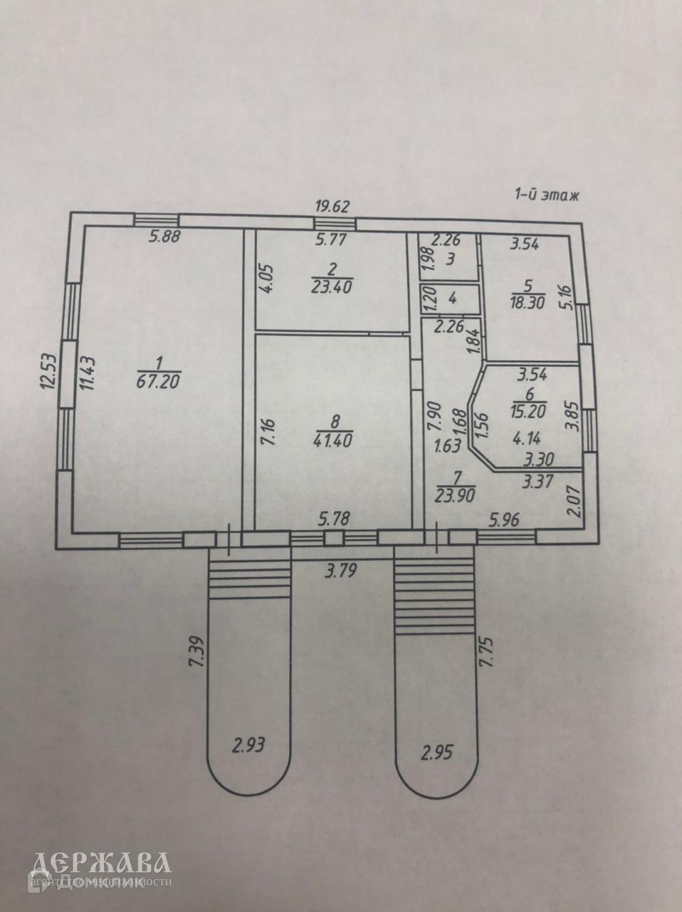 1й этаж имеет 2 входа, состоит из прихожей 24 кв.м., хозпомешения 67 кв.м., кухни 23 кв.м., гостиная 41 кв.м., туалет и 2 спальных комнаты 15 кв.м. и 18 кв.м..