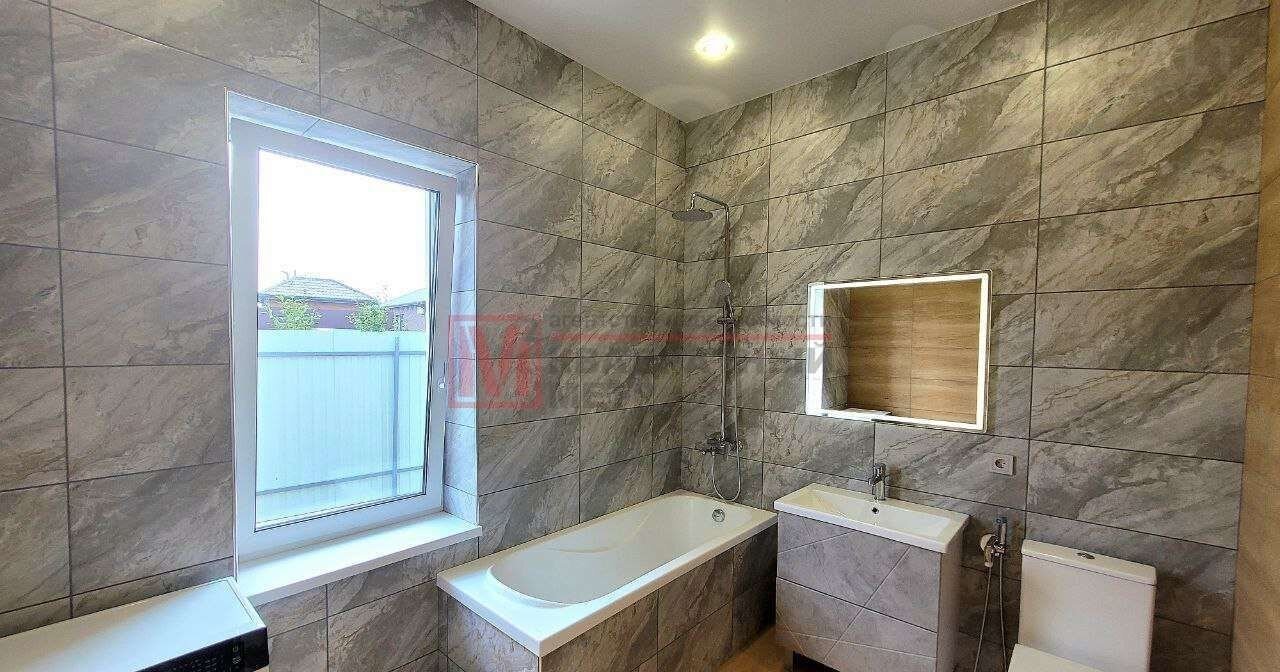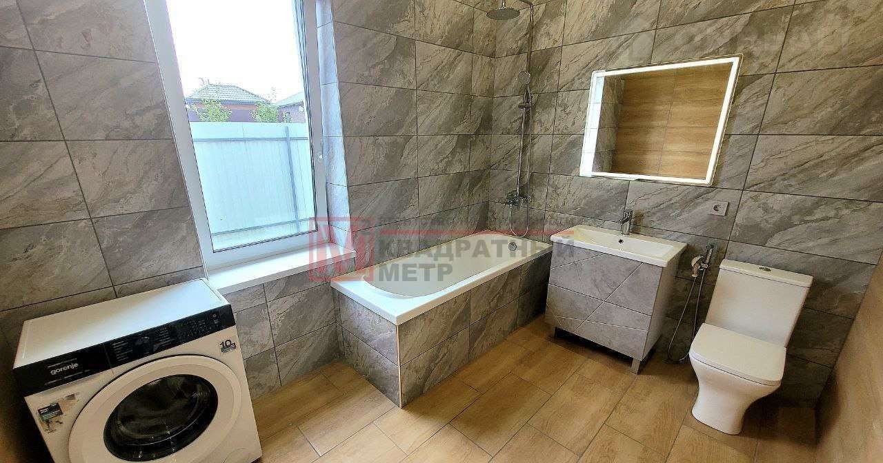 Полностью покрыт керамогранитом, новая стиральная машина, стильный санфаянс и зеркало с подсветкой.