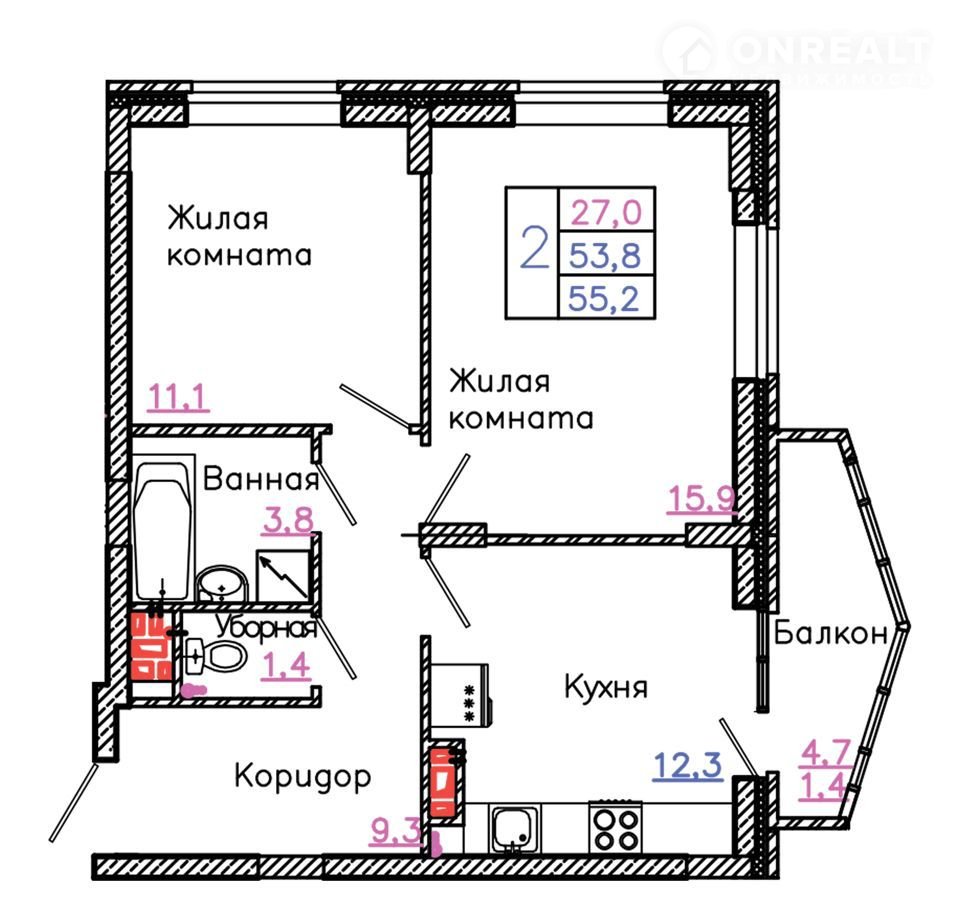 Общая площадь 55.2 м2