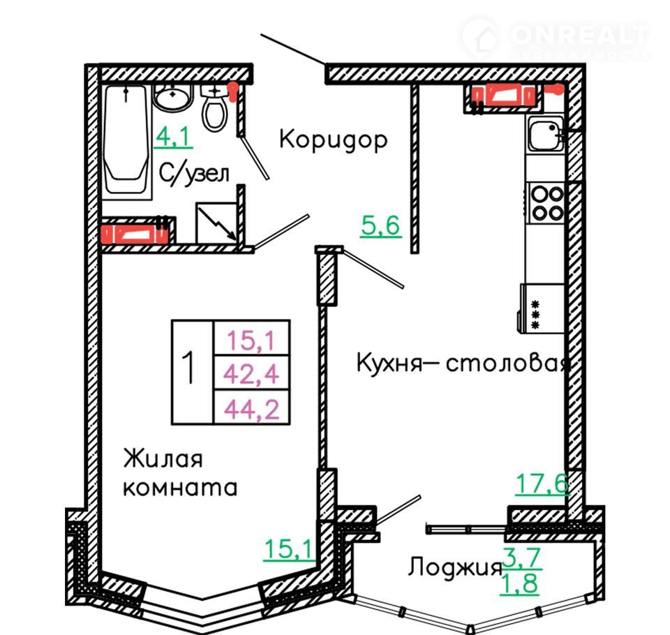 Общая площадь 44.2 м2