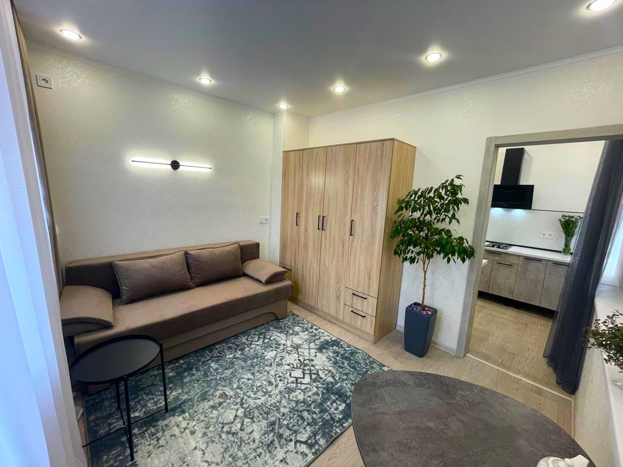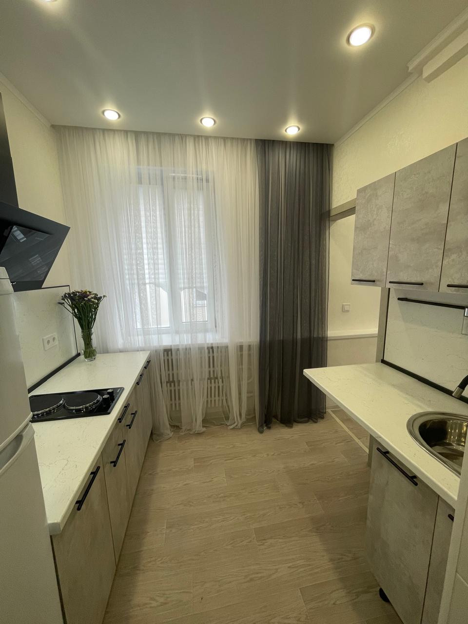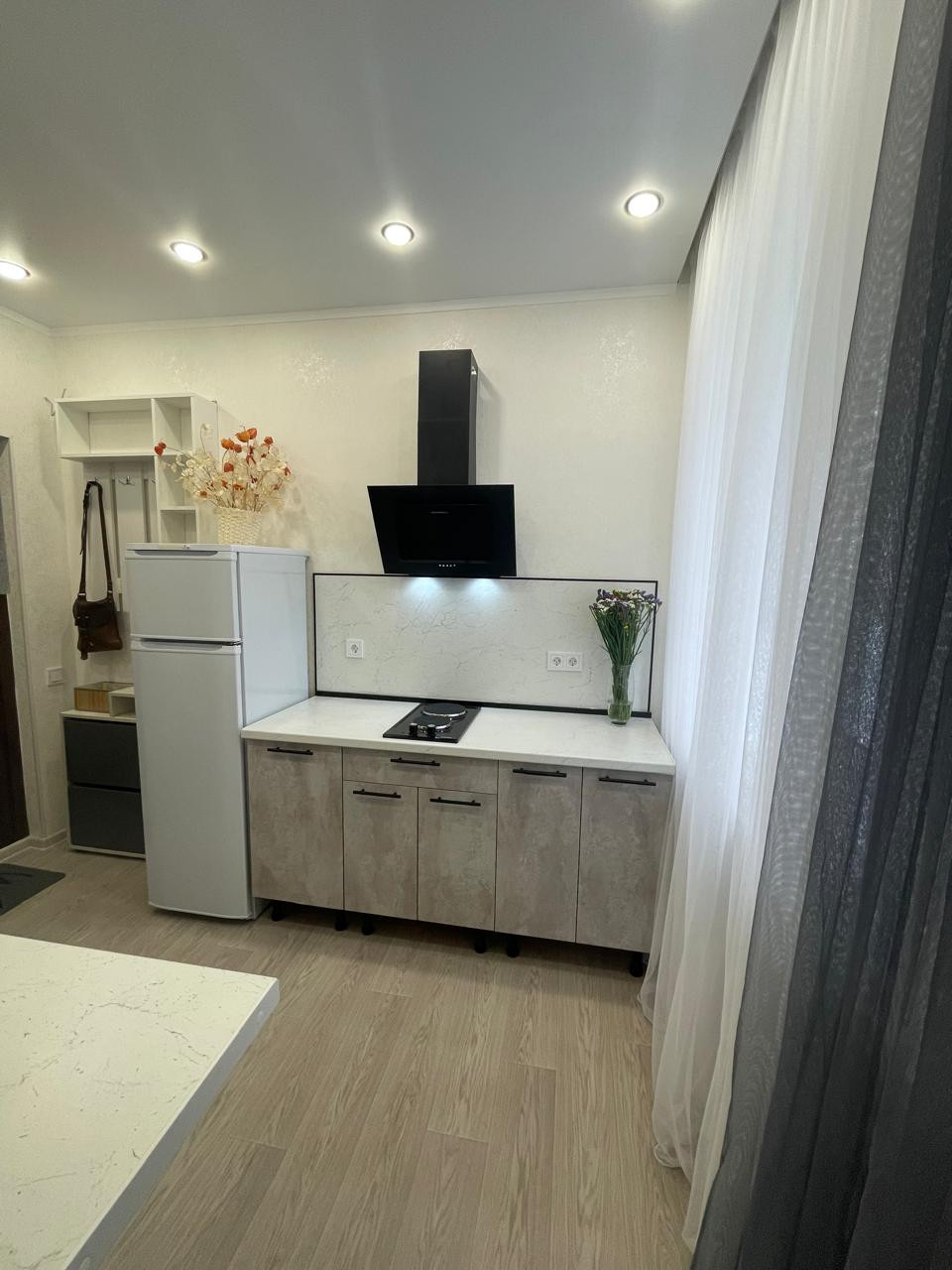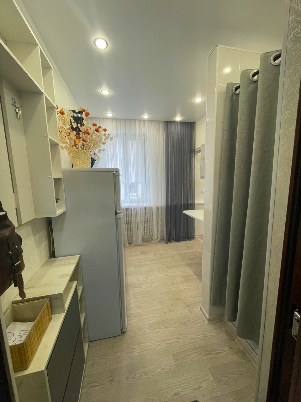 Прихожая, кухня, вытяжка, электрическая встроенная плита, вытяжка,холодильник, водонагреватель, стол со стульями, диван кровать раскладной (спальное место-150см),коврик, шкаф, прихожая, шторы...(всё новое)